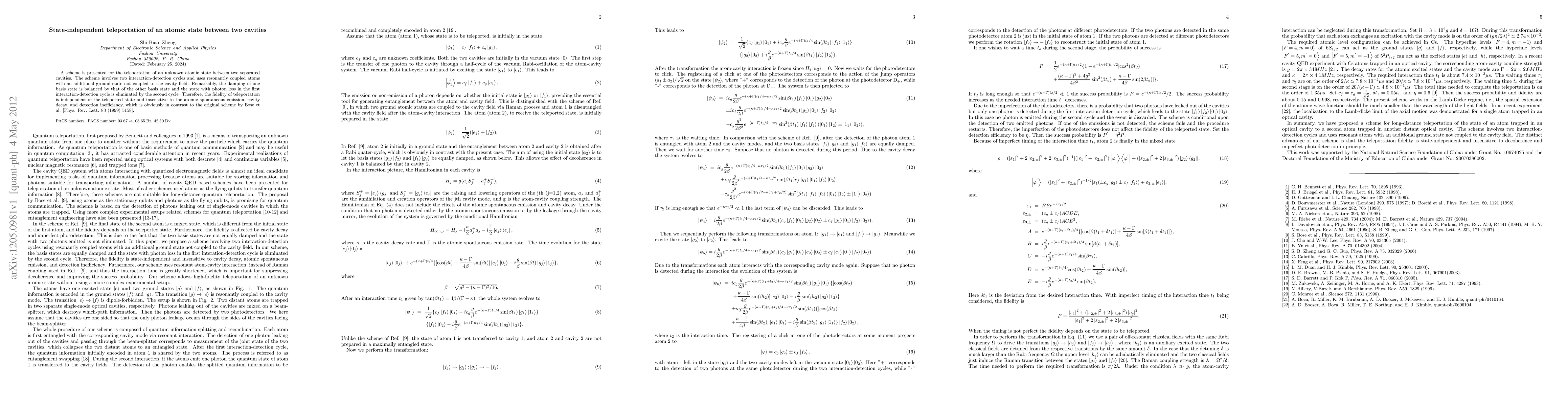 This paper proposes a novel scheme for state-independent teleportation of an atomic state between two cavities, utilizing resonantly coupled atoms and two interaction-detection cycles. The method achieves high fidelity teleportation, independent of the initial state and robust against spontaneous emission, cavity decay, and detection inefficiencies.