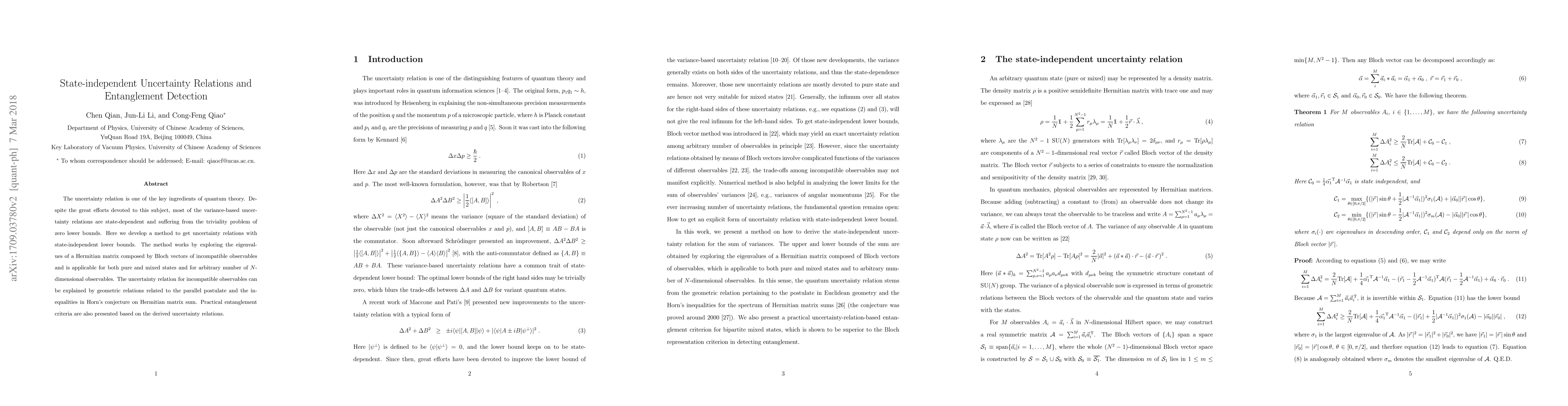 This paper develops state-independent uncertainty relations that overcome the limitations of traditional variance-based relations, using geometric relations and Horn's conjecture. It also provides practical entanglement detection criteria based on these new uncertainty relations.