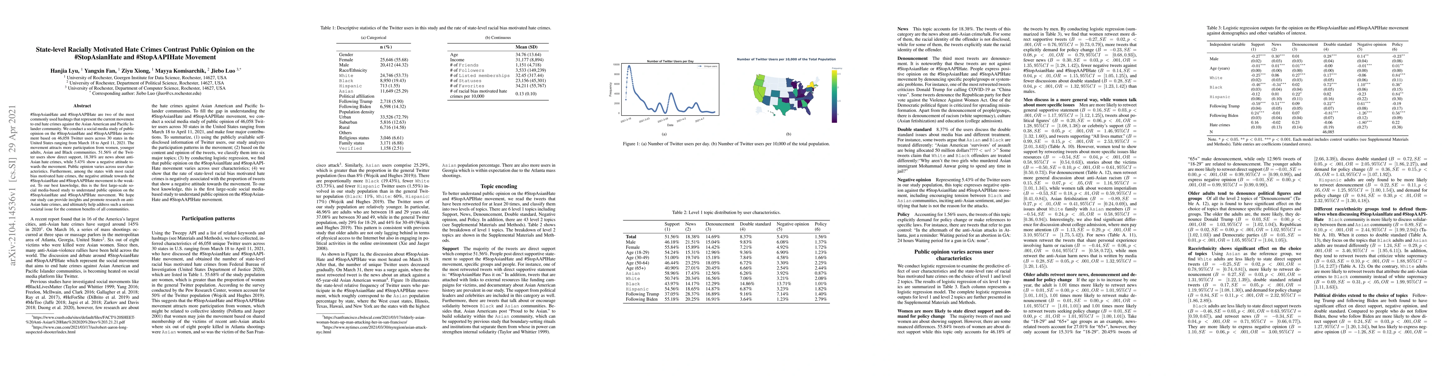This study analyzes public opinion on the #StopAsianHate and #StopAAPIHate movements via Twitter data from 46,058 users across 30 U.S. states, finding higher support from women, younger adults, and Asian and Black communities, with varying attitudes across states, especially those with high racial bias hate crimes.