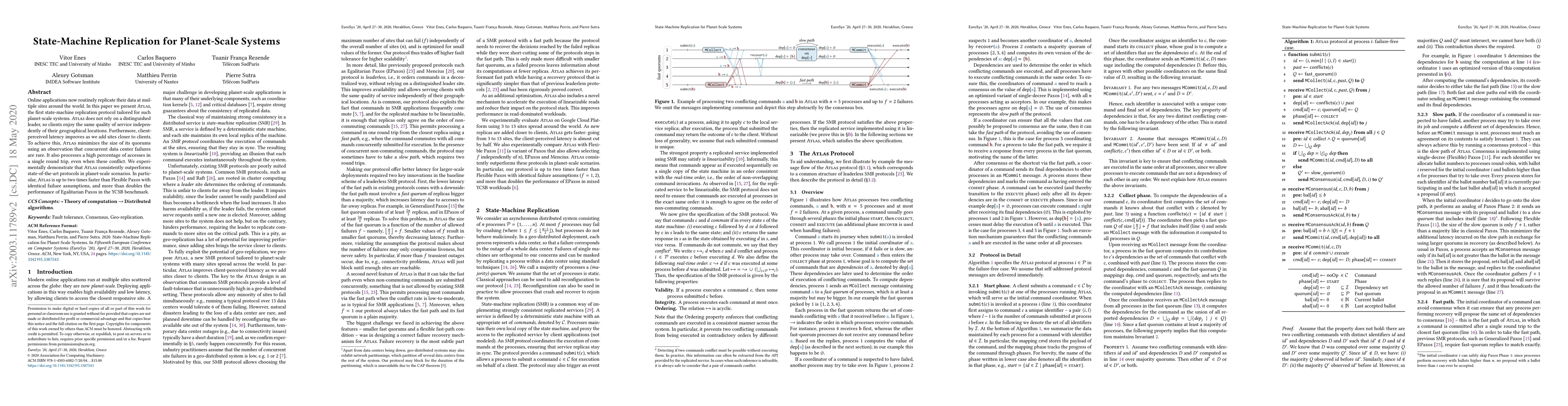 This paper introduces Atlas, a state-machine replication protocol designed for planet-scale systems, which enhances performance by minimizing quorum size and optimizing single round trip accesses. Experimental results show Atlas significantly outperforms existing protocols, achieving up to double the speed of Flexible Paxos and more than double that of Egalitarian Paxos.