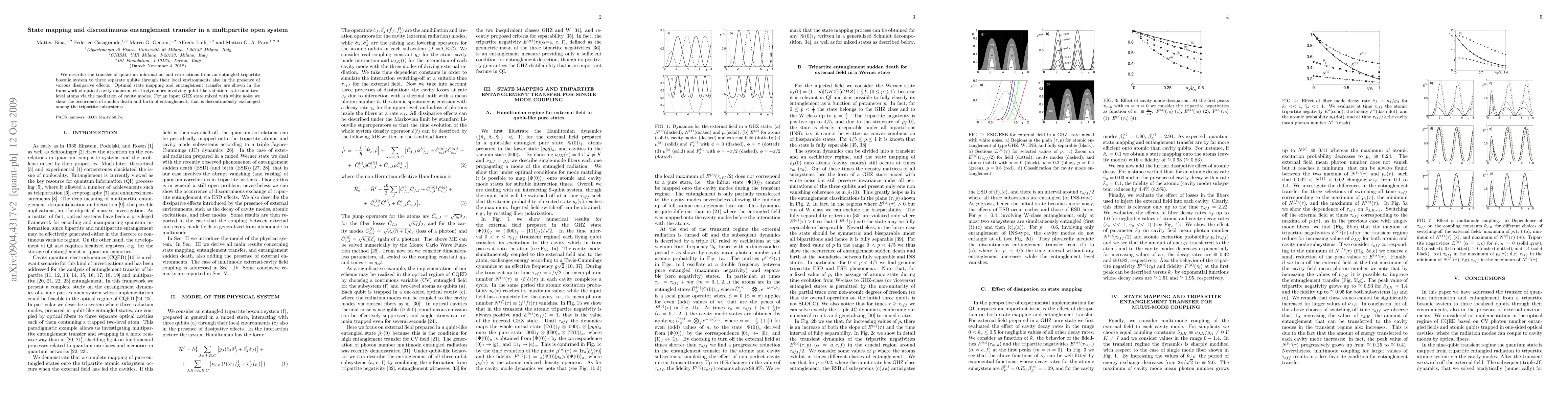 This paper investigates the optimal transfer of quantum information and entanglement from an entangled tripartite bosonic system to three separate qubits, considering various dissipative effects. It demonstrates discontinuous entanglement transfer and sudden death/birth phenomena in the context of optical cavity quantum electrodynamics.