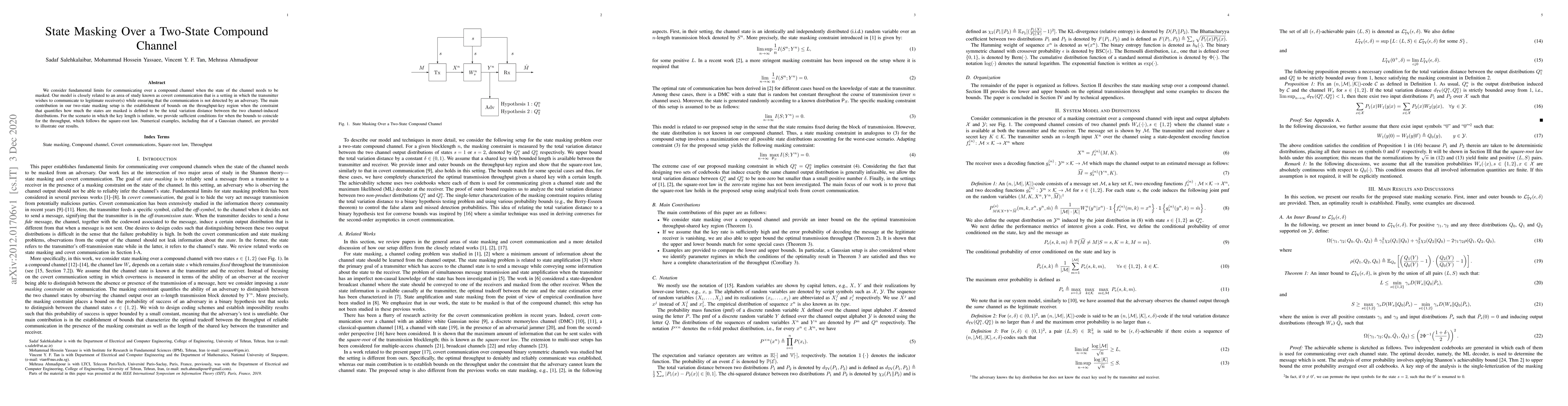 We consider fundamental limits for communicating over a compound channel when the state of the channel needs to be masked. Our model is closely related to an area of study known as covert communication that is a setting in which the transmitter wishes to communicate to legitimate receiver(s) while ensuring that the communication is not detected by an adversary. The main contribution in our two-state masking setup is the establishment of bounds on the throughput-key region when the constraint that quantifies how much the states are masked is defined to be the total variation distance between the two channel-induced distributions. For the scenario in which the key length is infinite, we provide sufficient conditions for when the bounds to coincide for the throughput, which follows the square-root law. Numerical examples, including that of a Gaussian channel, are provided to illustrate our results.