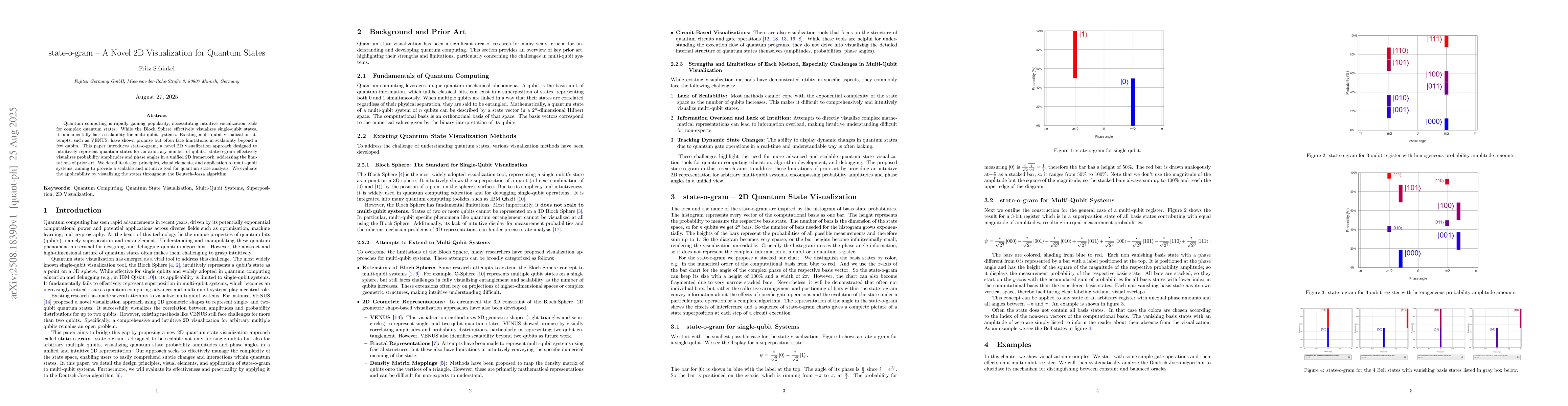 Quantum computing is rapidly gaining popularity, necessitating intuitive visualization tools for complex quantum states. While the Bloch Sphere effectively visualizes single-qubit states, it fundamentally lacks scalability for multi-qubit systems. Existing multi-qubit visualization attempts, such as VENUS, have shown promise but often face limitations in scalability beyond a few qubits. This paper introduces state-o-gram, a novel 2D visualization approach designed to intuitively represent quantum states for an arbitrary number of qubits. state-o-gram effectively visualizes probability amplitudes and phase angles in a unified 2D framework, addressing the limitations of prior art. We detail its design principles, visual elements, and application to multi-qubit systems, aiming to provide a scalable and intuitive tool for quantum state analysis. We evaluate the applicability by visualizing the states throughout the Deutsch-Josza algorithm.