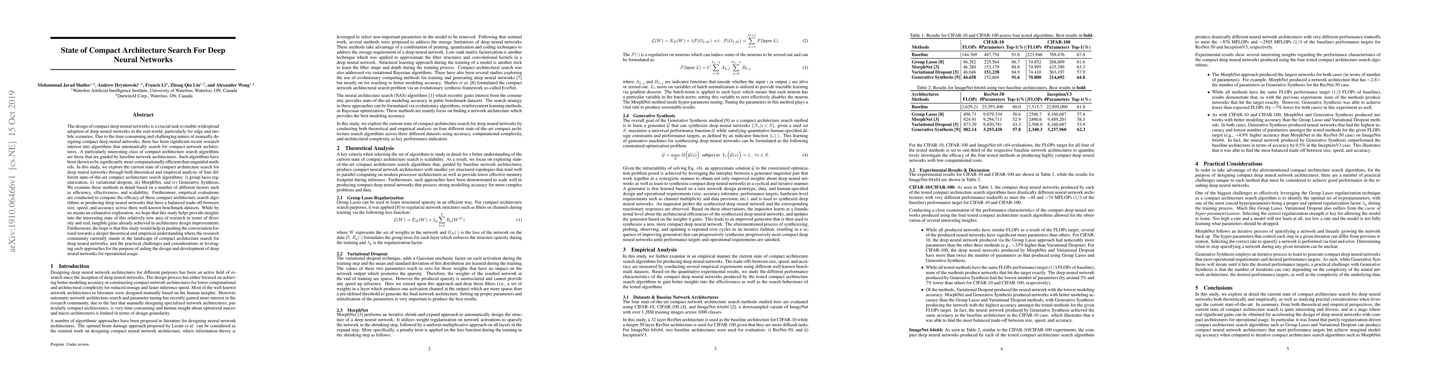 This paper reviews the current state of compact architecture search algorithms for deep neural networks, focusing on four state-of-the-art methods: group lasso regularization, variational dropout, MorphNet, and Generative Synthesis. It provides both theoretical and empirical analyses to evaluate their efficiency, effectiveness, and scalability, and compares them across three benchmark datasets.