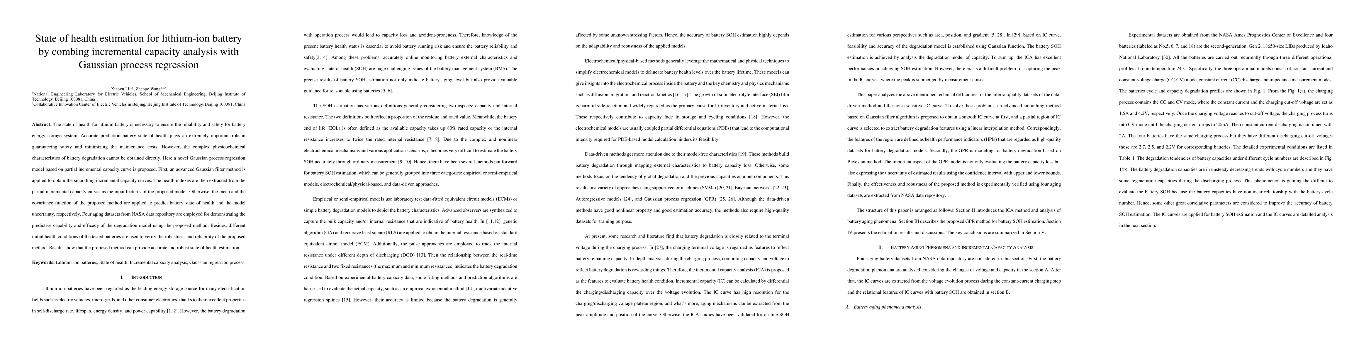 This paper proposes a novel Gaussian process regression model combining incremental capacity analysis to accurately estimate the state of health for lithium-ion batteries. The method uses smoothing incremental capacity curves and extracted features to predict battery health, demonstrating robustness and efficacy using NASA data.