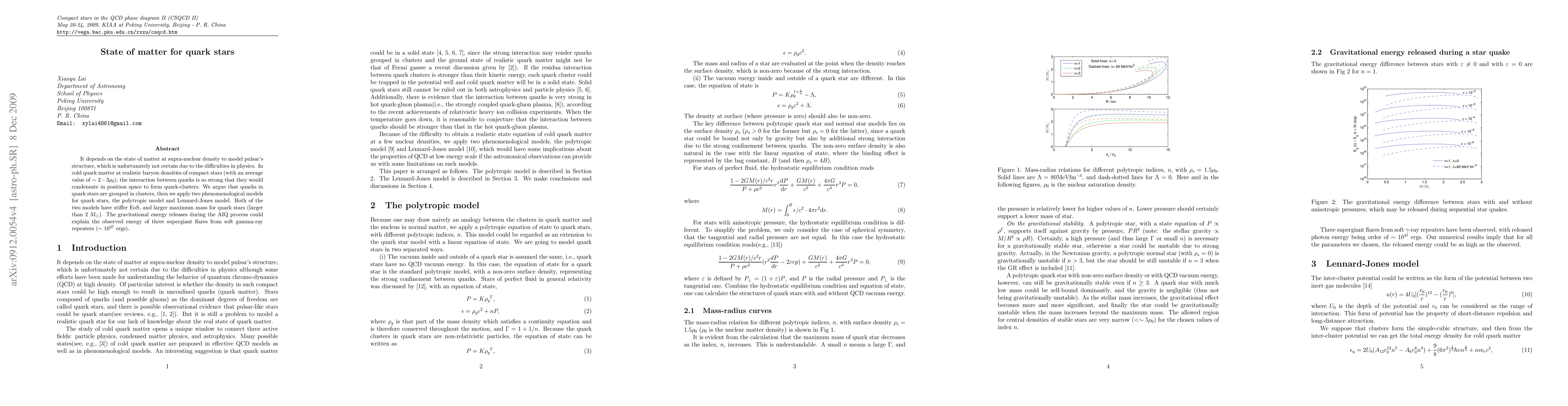 It depends on the state of matter at supra-nuclear density to model pulsar's structure, which is unfortunately not certain due to the difficulties in physics. In cold quark matter at realistic baryon densities of compact stars (with an average value of $\sim 2-3\rho_0$), the interaction between quarks is so strong that they would condensate in position space to form quark-clusters. We argue that quarks in quark stars are grouped in clusters, then we apply two phenomenological models for quark stars, the polytropic model and Lennard-Jones model. Both of the two models have stiffer EoS, and larger maximum mass for quark stars (larger than 2 $M_\odot$). The gravitational energy releases during the AIQ process could explain the observed energy of three supergiant flares from soft gamma-ray repeaters ($\sim 10^{47}$ ergs).