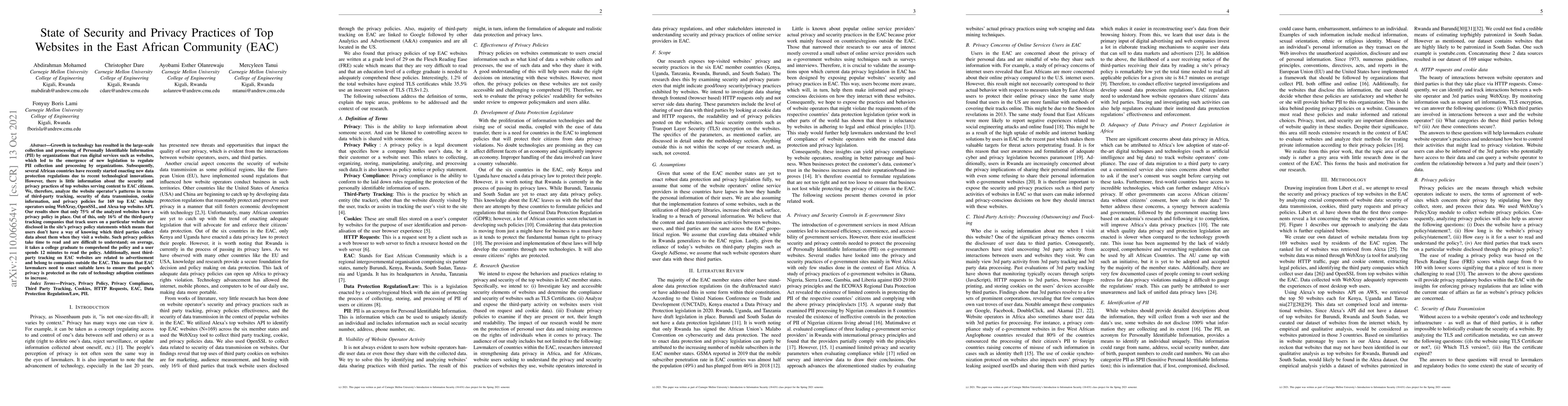 This study examines the security and privacy practices of top East African Community (EAC) websites, finding that only 75% have privacy policies, and only 16% disclose third-party tracking companies. Most tracking is for advertising and involves non-EAC companies, highlighting the need for stronger data protection regulations.