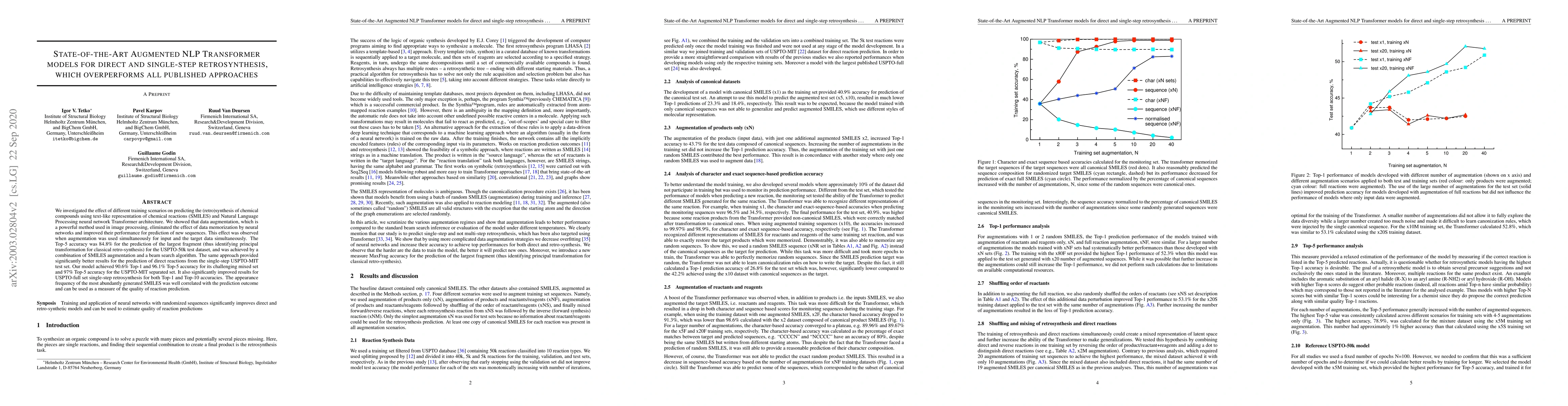 We investigated the effect of different training scenarios on predicting the (retro)synthesis of chemical compounds using a text-like representation of chemical reactions (SMILES) and Natural Language Processing neural network Transformer architecture. We showed that data augmentation, which is a powerful method used in image processing, eliminated the effect of data memorization by neural networks, and improved their performance for the prediction of new sequences. This effect was observed when augmentation was used simultaneously for input and the target data simultaneously. The top-5 accuracy was 84.8% for the prediction of the largest fragment (thus identifying principal transformation for classical retro-synthesis) for the USPTO-50k test dataset and was achieved by a combination of SMILES augmentation and a beam search algorithm. The same approach provided significantly better results for the prediction of direct reactions from the single-step USPTO-MIT test set. Our model achieved 90.6% top-1 and 96.1% top-5 accuracy for its challenging mixed set and 97% top-5 accuracy for the USPTO-MIT separated set. It also significantly improved results for USPTO-full set single-step retrosynthesis for both top-1 and top-10 accuracies. The appearance frequency of the most abundantly generated SMILES was well correlated with the prediction outcome and can be used as a measure of the quality of reaction prediction.