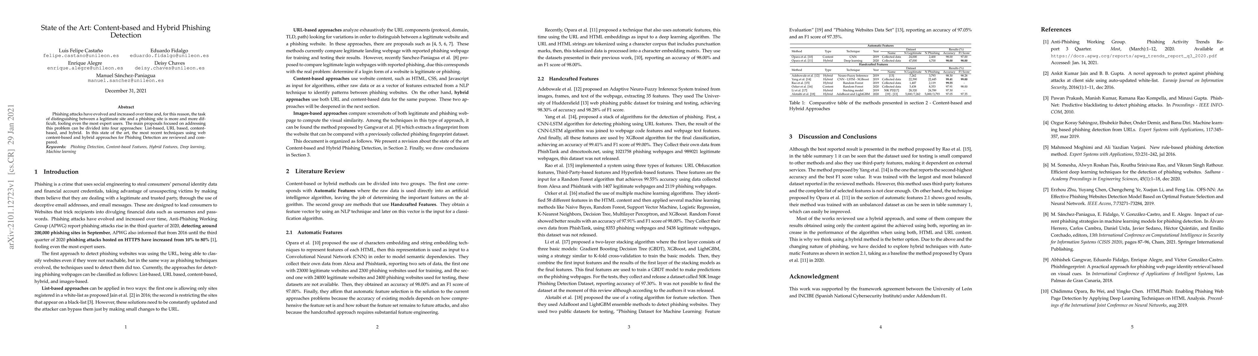 Phishing attacks have evolved and increased over time and, for this reason, the task of distinguishing between a legitimate site and a phishing site is more and more difficult, fooling even the most expert users. The main proposals focused on addressing this problem can be divided into four approaches: List-based, URL based, content-based, and hybrid. In this state of the art, the most recent techniques using web content-based and hybrid approaches for Phishing Detection are reviewed and compared.