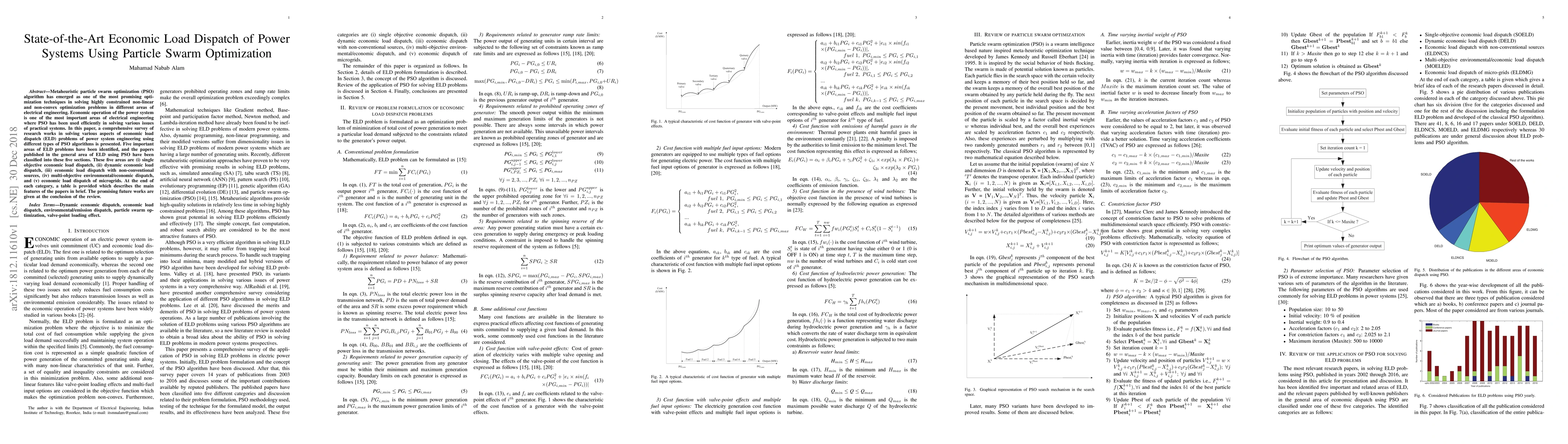 This paper provides a comprehensive survey of economic load dispatch (ELD) in power systems using particle swarm optimization (PSO), categorizing research into five areas: single objective, dynamic, non-conventional sources, multi-objective, and microgrids. Each category includes a table summarizing key features of relevant studies, highlighting PSO's effectiveness in solving various ELD problems.