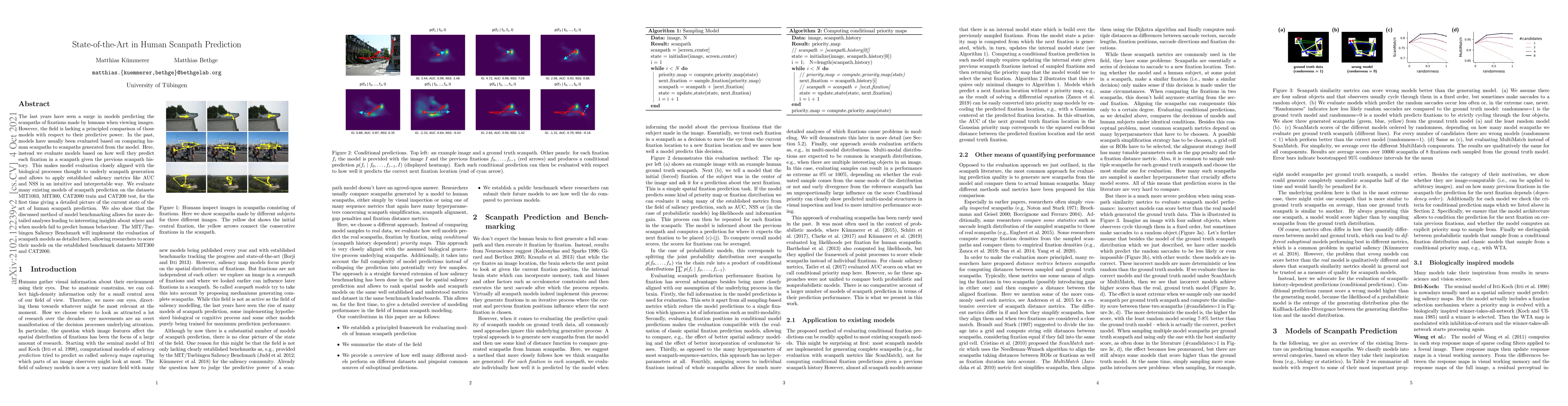 The last years have seen a surge in models predicting the scanpaths of fixations made by humans when viewing images. However, the field is lacking a principled comparison of those models with respect to their predictive power. In the past, models have usually been evaluated based on comparing human scanpaths to scanpaths generated from the model. Here, instead we evaluate models based on how well they predict each fixation in a scanpath given the previous scanpath history. This makes model evaluation closely aligned with the biological processes thought to underly scanpath generation and allows to apply established saliency metrics like AUC and NSS in an intuitive and interpretable way. We evaluate many existing models of scanpath prediction on the datasets MIT1003, MIT300, CAT2000 train and CAT200 test, for the first time giving a detailed picture of the current state of the art of human scanpath prediction. We also show that the discussed method of model benchmarking allows for more detailed analyses leading to interesting insights about where and when models fail to predict human behaviour. The MIT/Tuebingen Saliency Benchmark will implement the evaluation of scanpath models as detailed here, allowing researchers to score their models on the established benchmark datasets MIT300 and CAT2000.