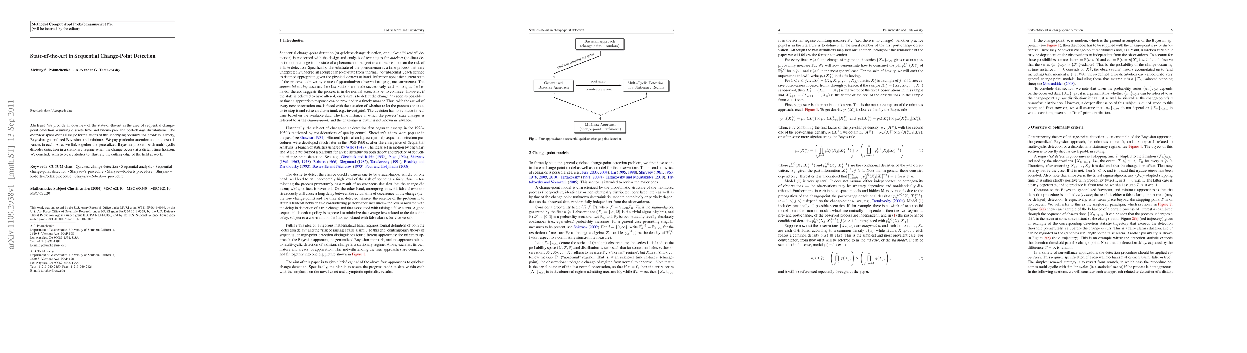 We provide an overview of the state-of-the-art in the area of sequential change-point detection assuming discrete time and known pre- and post-change distributions. The overview spans over all major formulations of the underlying optimization problem, namely, Bayesian, generalized Bayesian, and minimax. We pay particular attention to the latest advances in each. Also, we link together the generalized Bayesian problem with multi-cyclic disorder detection in a stationary regime when the change occurs at a distant time horizon. We conclude with two case studies to illustrate the cutting edge of the field at work.