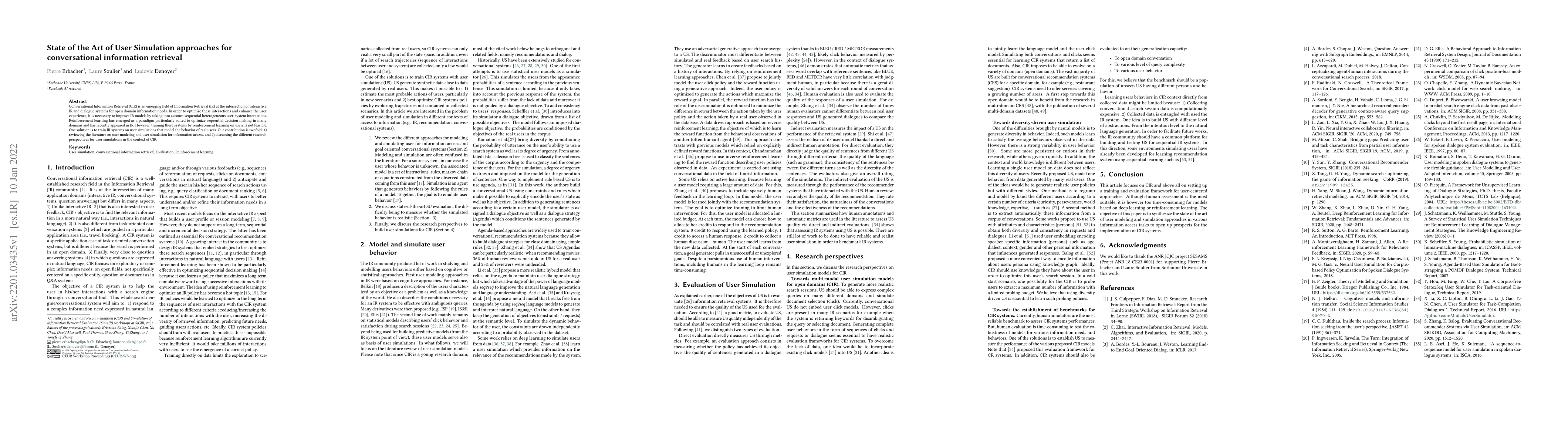 Conversational Information Retrieval (CIR) is an emerging field of Information Retrieval (IR) at the intersection of interactive IR and dialogue systems for open domain information needs. In order to optimize these interactions and enhance the user experience, it is necessary to improve IR models by taking into account sequential heterogeneous user-system interactions. Reinforcement learning has emerged as a paradigm particularly suited to optimize sequential decision making in many domains and has recently appeared in IR. However, training these systems by reinforcement learning on users is not feasible. One solution is to train IR systems on user simulations that model the behavior of real users. Our contribution is twofold: 1)reviewing the literature on user modeling and user simulation for information access, and 2) discussing the different research perspectives for user simulations in the context of CIR