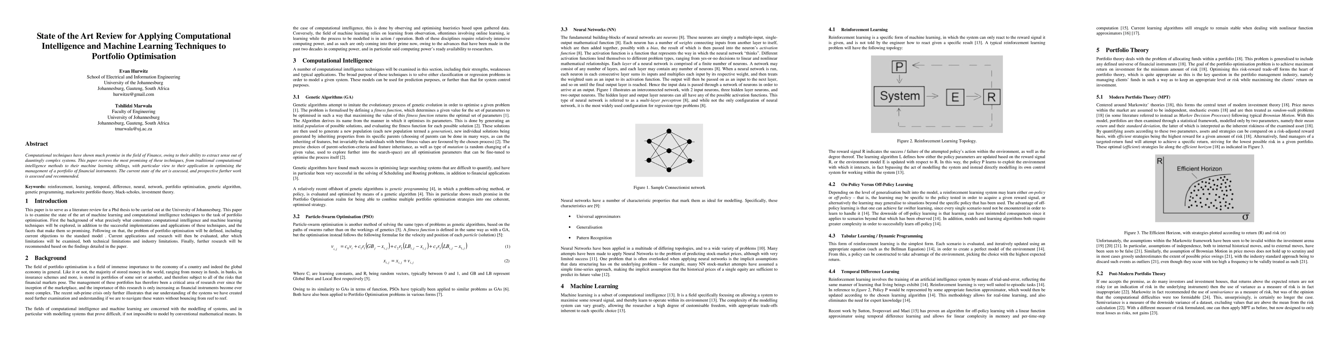 Computational techniques have shown much promise in the field of Finance, owing to their ability to extract sense out of dauntingly complex systems. This paper reviews the most promising of these techniques, from traditional computational intelligence methods to their machine learning siblings, with particular view to their application in optimising the management of a portfolio of financial instruments. The current state of the art is assessed, and prospective further work is assessed and recommended
