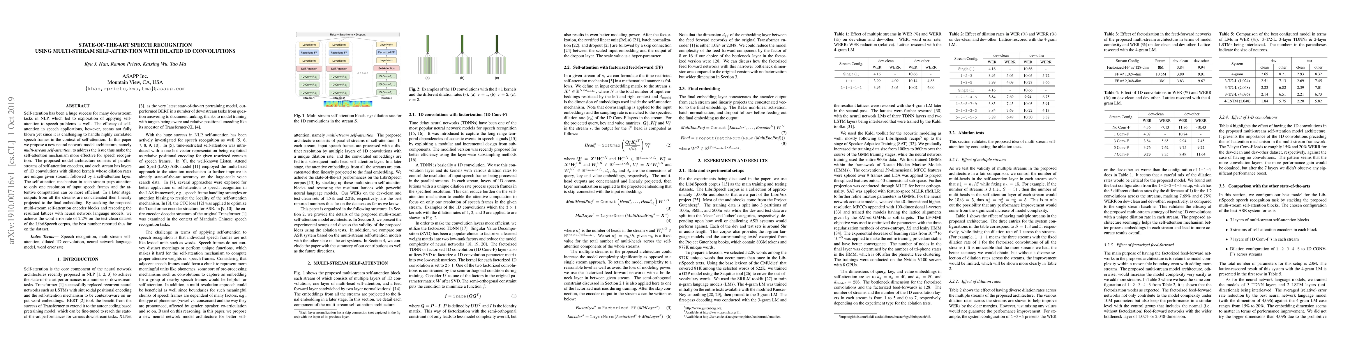 This paper introduces a multi-stream self-attention model with dilated 1D convolutions to enhance speech recognition, achieving a word error rate of 2.2% on LibriSpeech, the best result to date. The model uses parallel self-attention streams, each with dilated convolutions, to efficiently handle different resolutions of speech frames.