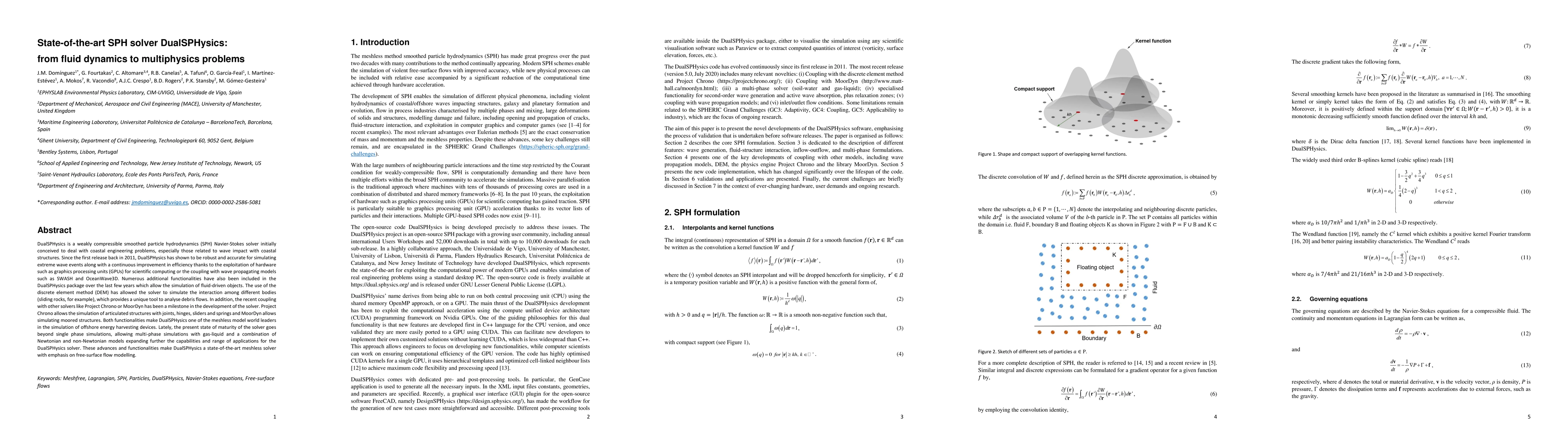 DualSPHysics is a weakly compressible smoothed particle hydrodynamics (SPH) Navier-Stokes solver initially conceived to deal with coastal engineering problems, especially those related to wave impact with coastal structures. Since the first release back in 2011, DualSPHysics has shown to be robust and accurate for simulating extreme wave events along with a continuous improvement in efficiency thanks to the exploitation of hardware such as graphics processing units (GPUs) for scientific computing or the coupling with wave propagating models such as SWASH and OceanWave3D. Numerous additional functionalities have also been included in the DualSPHysics package over the last few years which allow the simulation of fluid-driven objects. The use of the discrete element method (DEM) has allowed the solver to simulate the interaction among different bodies (sliding rocks, for example), which provides a unique tool to analyse debris flows. In addition, the recent coupling with other solvers like Project Chrono or MoorDyn has been a milestone in the development of the solver. Project Chrono allows the simulation of articulated structures with joints, hinges, sliders and springs and MoorDyn allows simulating moored structures. Both functionalities make DualSPHysics one of the meshless model world leaders in the simulation of offshore energy harvesting devices. Lately, the present state of maturity of the solver goes beyond single phase simulations, allowing multi-phase simulations with gas-liquid and a combination of Newtonian and non-Newtonian models expanding further the capabilities and range of applications for the DualSPHysics solver. These advances and functionalities make DualSPHysics a state-of-the-art meshless solver with emphasis on free-surface flow modelling.