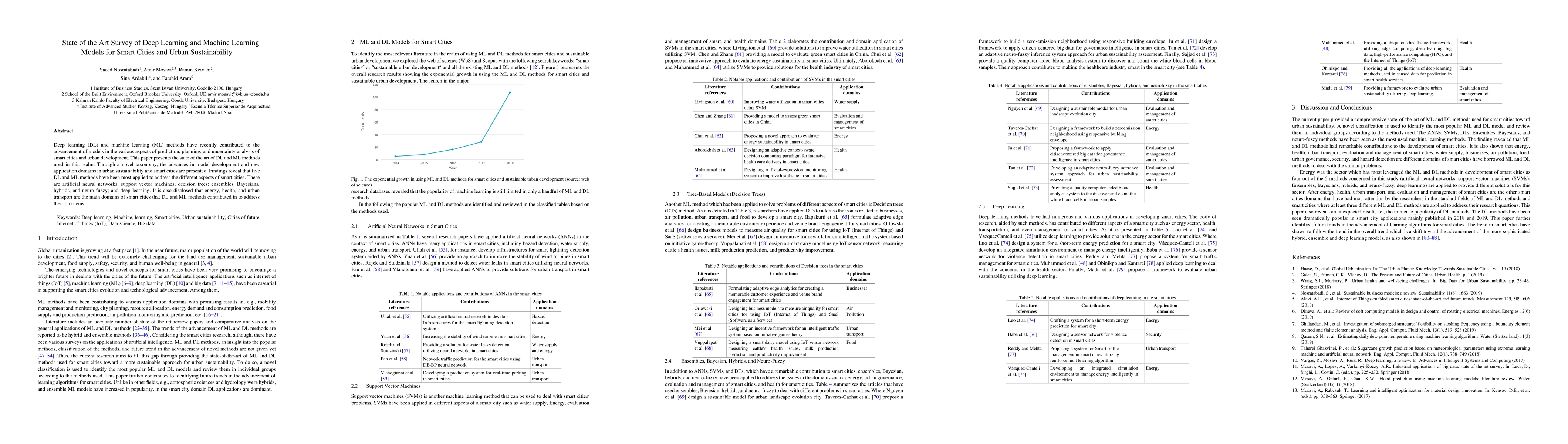 This paper surveys the latest advancements in deep learning and machine learning models for smart cities and urban sustainability, categorizing the most applied methods and highlighting their contributions to energy, health, and urban transport domains. The findings underscore the importance of artificial neural networks, support vector machines, and other techniques in enhancing urban development.