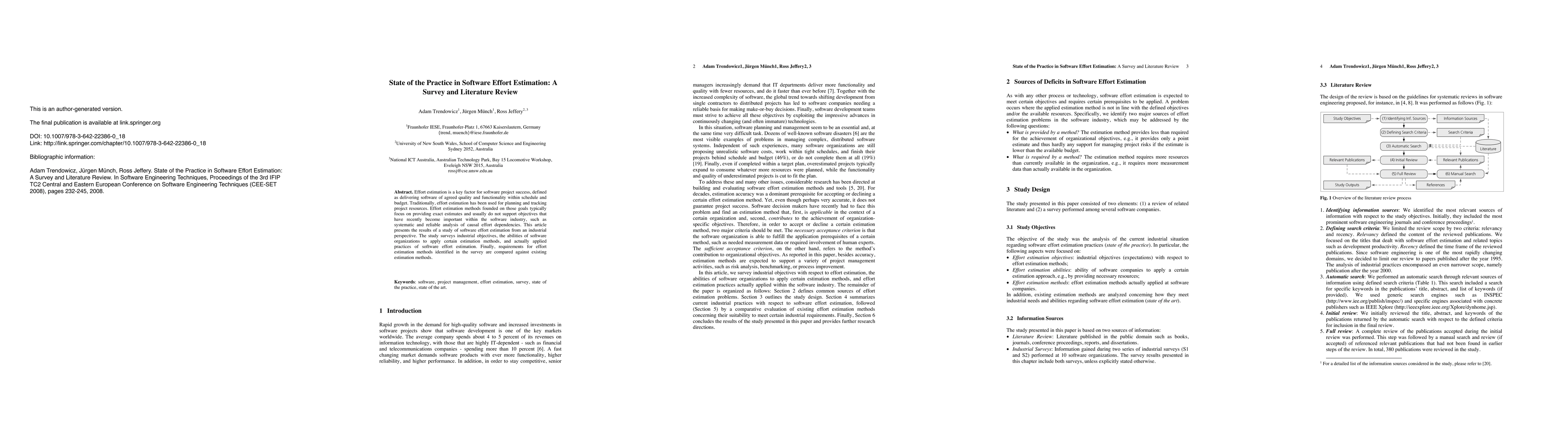 Effort estimation is a key factor for software project success, defined as delivering software of agreed quality and functionality within schedule and budget. Traditionally, effort estimation has been used for planning and tracking project resources. Effort estimation methods founded on those goals typically focus on providing exact estimates and usually do not support objectives that have recently become important within the software industry, such as systematic and reliable analysis of causal effort dependencies. This article presents the results of a study of software effort estimation from an industrial perspective. The study surveys industrial objectives, the abilities of software organizations to apply certain estimation methods, and actually applied practices of software effort estimation. Finally, requirements for effort estimation methods identified in the survey are compared against existing estimation methods.