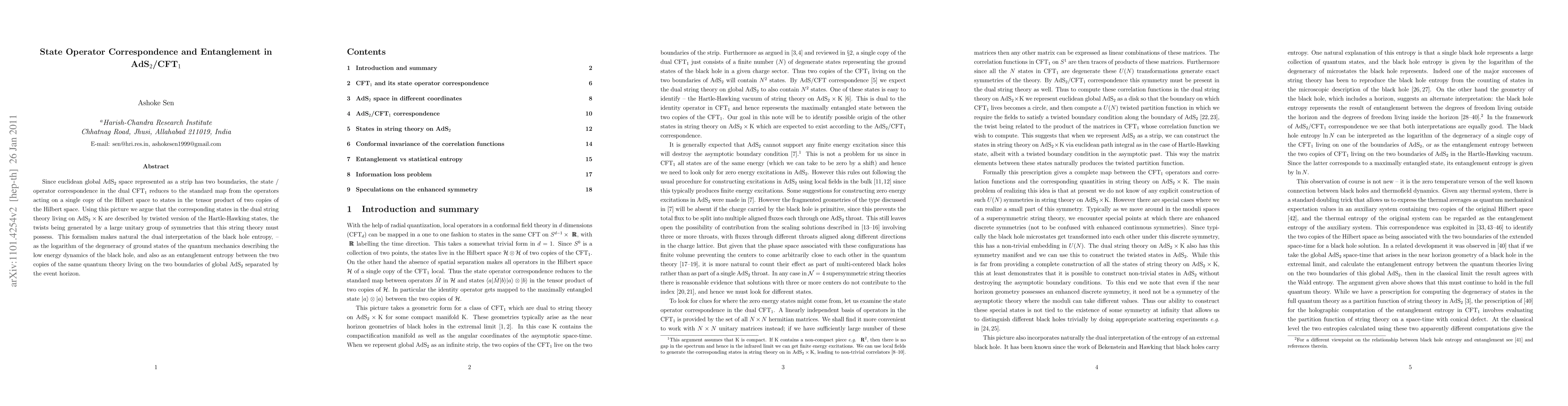 Since euclidean global AdS_2 space represented as a strip has two boundaries, the state / operator correspondence in the dual CFT_1 reduces to the standard map from the operators acting on a single copy of the Hilbert space to states in the tensor product of two copies of the Hilbert space. Using this picture we argue that the corresponding states in the dual string theory living on AdS_2 x K are described by twisted version of the Hartle-Hawking states, the twists being generated by a large unitary group of symmetries that this string theory must possess. This formalism makes natural the dual interpretation of the black hole entropy, -- as the logarithm of the degeneracy of ground states of the quantum mechanics describing the low energy dynamics of the black hole, and also as an entanglement entropy between the two copies of the same quantum theory living on the two boundaries of global AdS_2 separated by the event horizon.