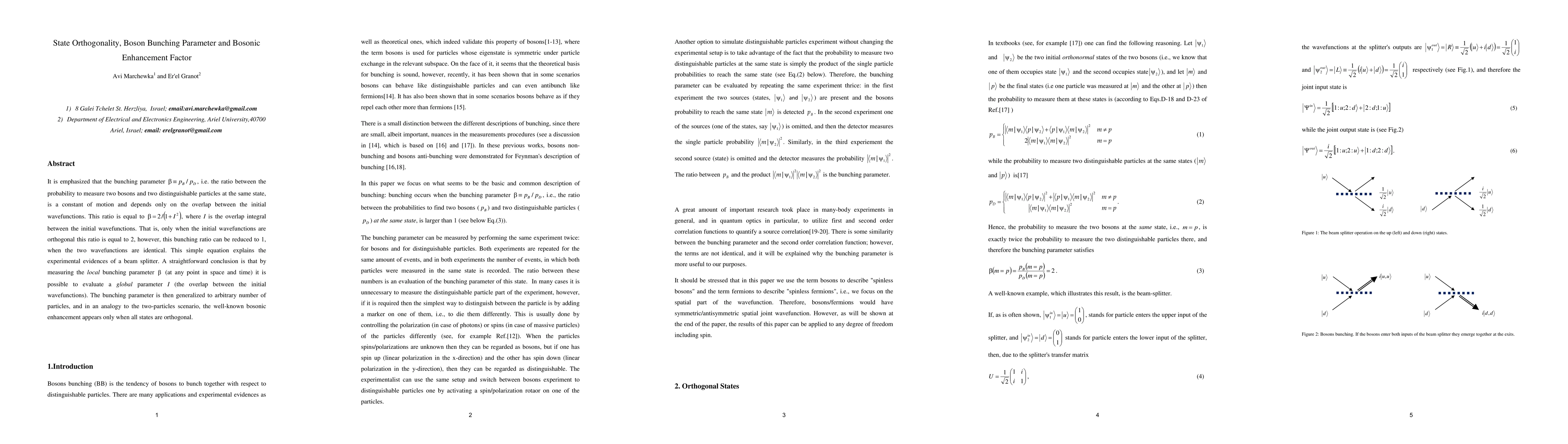 This paper discusses the relationship between the bunching parameter $\beta$ and state orthogonality in bosons, showing that $\beta=2/(1+I^2)$, where $I$ is the overlap integral. It concludes that $\beta$ equals 2 only when initial wavefunctions are orthogonal, and can reduce to 1 when they are identical, explaining beam splitter behavior and introducing bosonic enhancement as a result of orthogonal states.