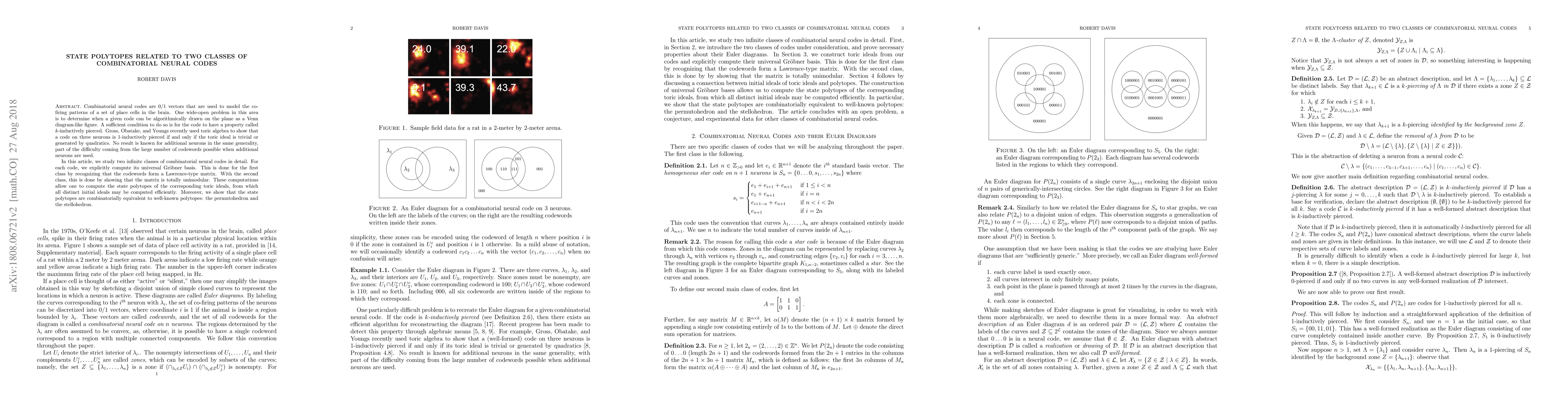 Combinatorial neural codes are $0/1$ vectors that are used to model the co-firing patterns of a set of place cells in the brain. One wide-open problem in this area is to determine when a given code can be algorithmically drawn in the plane as a Venn diagram-like figure. A sufficient condition to do so is for the code to have a property called $k$-inductively pierced. Gross, Obatake, and Youngs recently used toric algebra to show that a code on three neurons is $1$-inductively pierced if and only if the toric ideal is trivial or generated by quadratics. No result is known for additional neurons in the same generality, part of the difficulty coming from the large number of codewords possible when additional neurons are used. In this article, we study two infinite classes of combinatorial neural codes in detail. For each code, we explicitly compute its universal Gr\"obner basis. This is done for the first class by recognizing that the codewords form a Lawrence-type matrix. With the second class, this is done by showing that the matrix is totally unimodular. These computations allow one to compute the state polytopes of the corresponding toric ideals, from which all distinct initial ideals may be computed efficiently. Moreover, we show that the state polytopes are combinatorially equivalent to well-known polytopes: the permutohedron and the stellohedron.