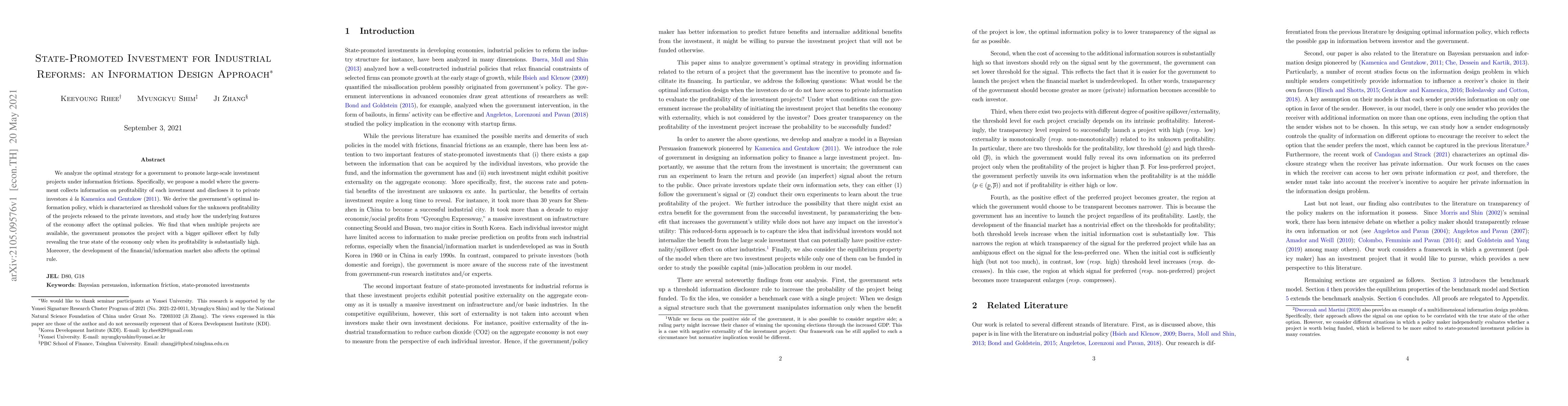 This paper develops a model to determine the optimal strategy for governments to promote large-scale investment projects under information frictions. It finds that governments should fully disclose favorable investment project probabilities only when they are substantially high, especially when projects have significant spillover effects, and the development of financial/information markets influences the optimal disclosure policy.