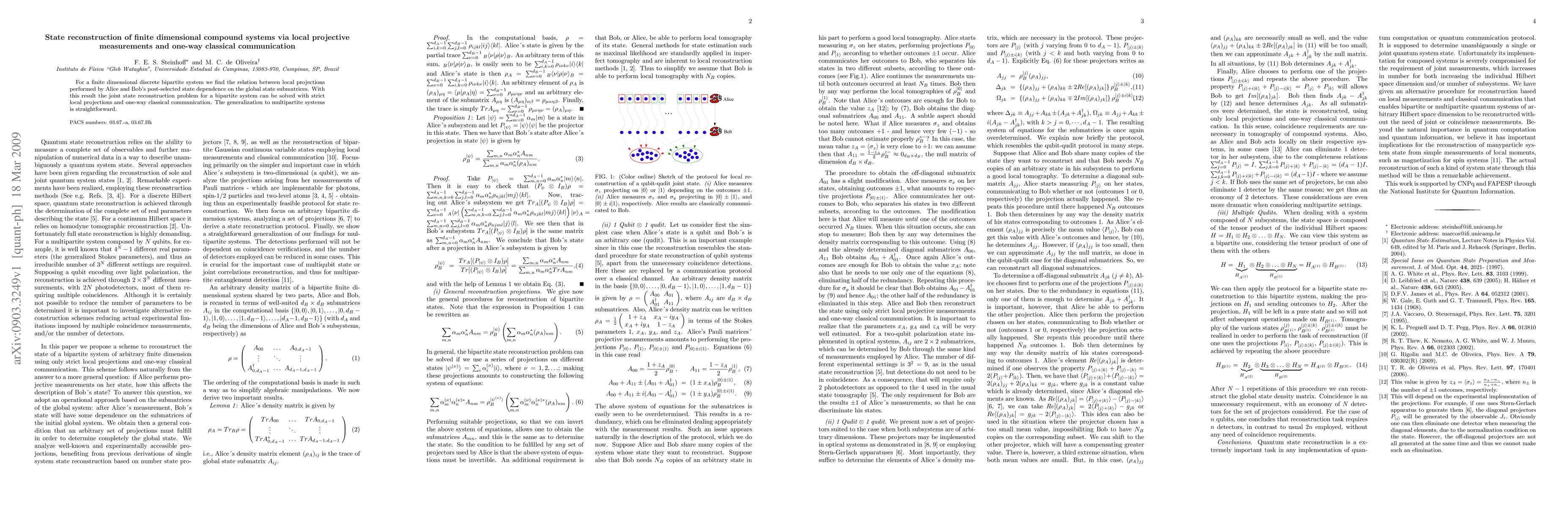 This research presents a method to reconstruct the state of finite dimensional compound systems using local projective measurements and one-way classical communication. The approach establishes a relationship between local projections by Alice and Bob's post-selected state, dependent on global state submatrices. This solution extends to multipartite systems, simplifying joint state reconstruction in bipartite systems with strict local projections.