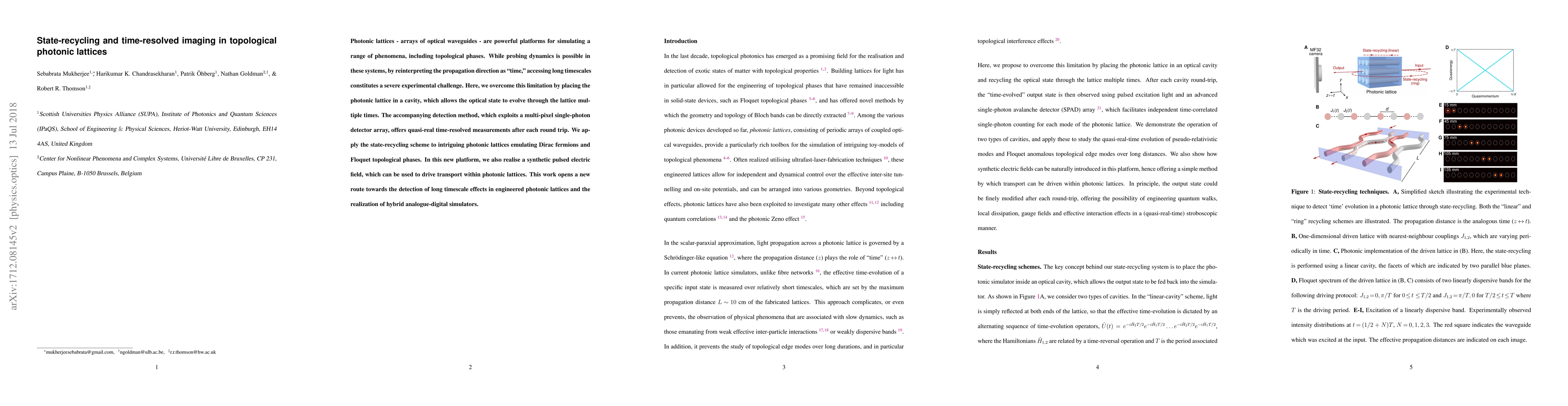 This paper presents a state-recycling technique in photonic lattices to enable long-timescale dynamics probing by repeatedly cycling the optical state through the lattice within a cavity. The method uses a multi-pixel detector for quasi-real-time measurements, facilitating the study of topological phases and synthetic electric fields in photonic systems.