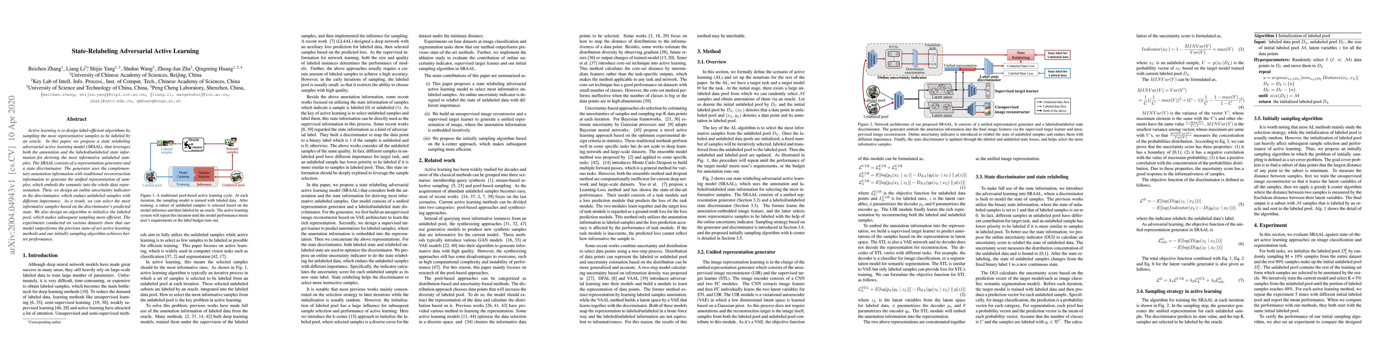 Active learning is to design label-efficient algorithms by sampling the most representative samples to be labeled by an oracle. In this paper, we propose a state relabeling adversarial active learning model (SRAAL), that leverages both the annotation and the labeled/unlabeled state information for deriving the most informative unlabeled samples. The SRAAL consists of a representation generator and a state discriminator. The generator uses the complementary annotation information with traditional reconstruction information to generate the unified representation of samples, which embeds the semantic into the whole data representation. Then, we design an online uncertainty indicator in the discriminator, which endues unlabeled samples with different importance. As a result, we can select the most informative samples based on the discriminator's predicted state. We also design an algorithm to initialize the labeled pool, which makes subsequent sampling more efficient. The experiments conducted on various datasets show that our model outperforms the previous state-of-art active learning methods and our initially sampling algorithm achieves better performance.