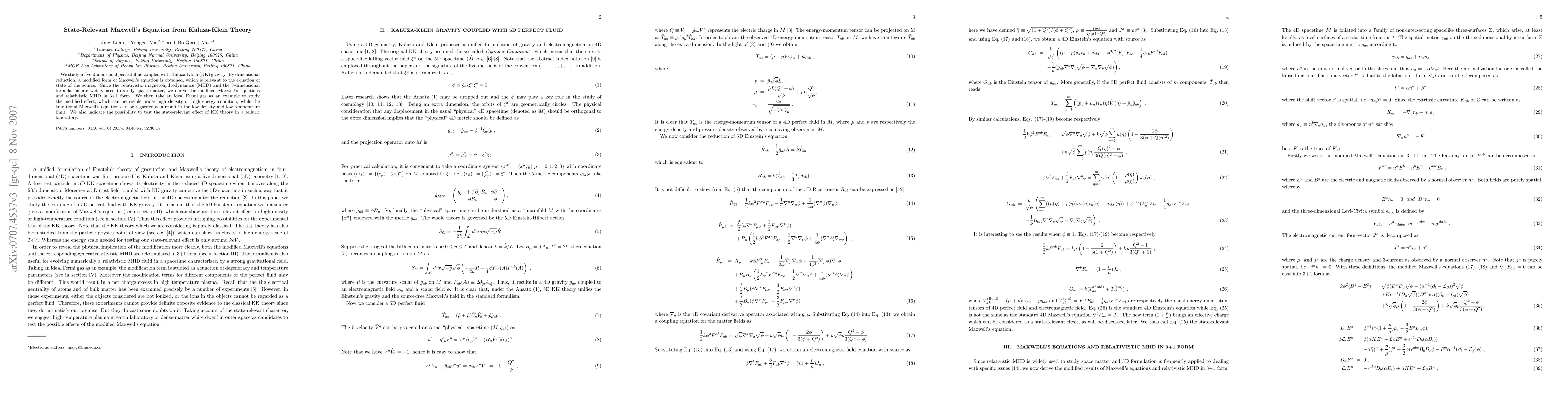 We study a five-dimensional perfect fluid coupled with Kaluza-Klein (KK) gravity. By dimensional reduction, a modified form of Maxwell's equation is obtained, which is relevant to the equation of state of the source. Since the relativistic magnetohydrodynamics (MHD) and the 3-dimensional formulation are widely used to study space matter, we derive the modified Maxwell's equations and relativistic MHD in 3+1 form. We then take an ideal Fermi gas as an example to study the modified effect, which can be visible under high density or high energy condition, while the traditional Maxwell's equation can be regarded as a result in the low density and low temperature limit. We also indicate the possibility to test the state-relevant effect of KK theory in a telluric laboratory.