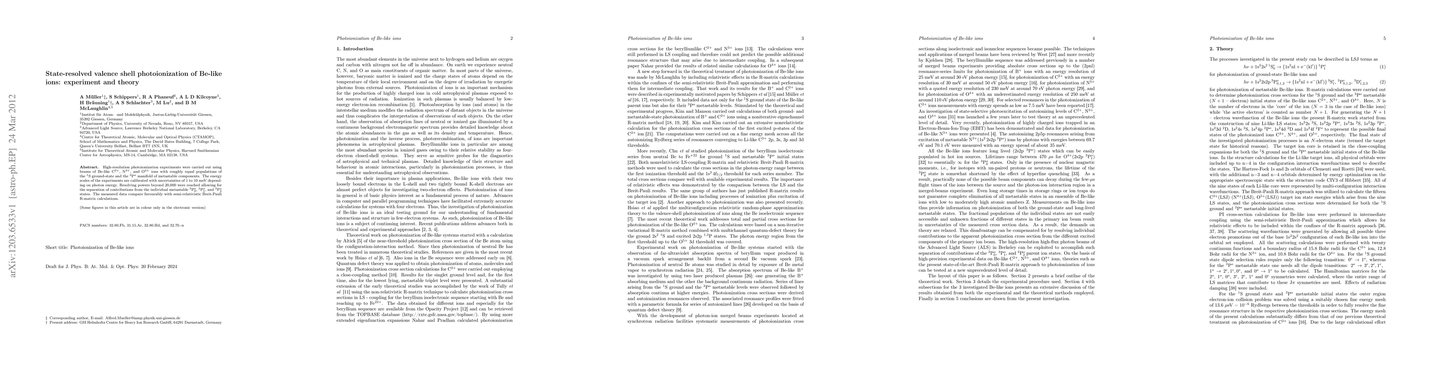 This study presents high-resolution photoionization experiments on Be-like ions (C$^{2+}$, N$^{3+}$, and O$^{4+}$), resolving individual metastable states with high precision. The results are well-matched by semi-relativistic Breit-Pauli R-matrix theory, providing detailed insights into the ionization processes.