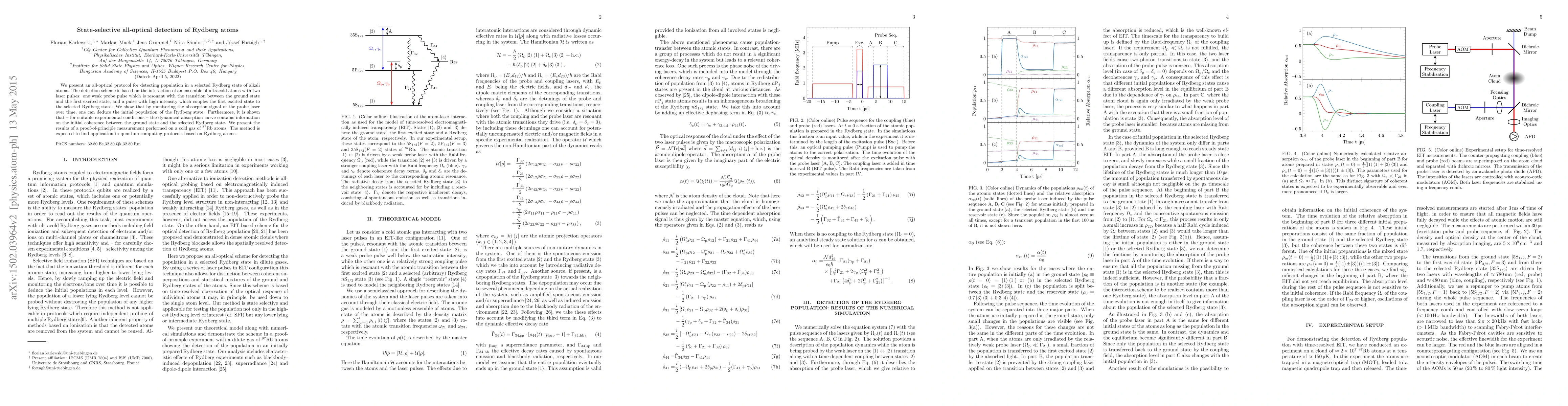 This paper introduces an all-optical method for detecting the population in a selected Rydberg state of alkali atoms using ultracold atoms. The technique involves monitoring the absorption of a probe laser after interaction with high-intensity coupling pulses, revealing initial state coherence and potential applications in quantum computing.