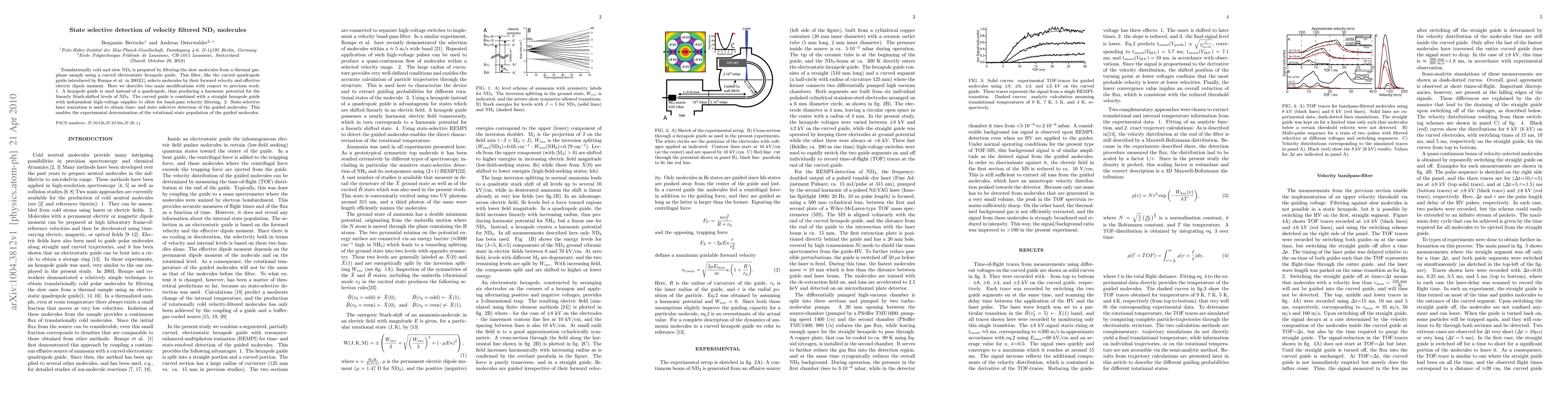Translationally cold and slow ND3 is prepared by filtering the slow molecules from a thermal gas-phase sample using a curved electrostatic hexapole guide. This filter, like the curved quadrupole guide introduced by Rempe et al. in 2003, selects molecules by their forward velocity and effective electric dipole moment. Here we describe two main modifications with respect to previous work: 1. A hexapole guide is used instead of a quadrupole, thus producing a harmonic potential for the linearly Stark-shifted levels of ND3. The curved guide is combined with a straight hexapole guide with independent high-voltage supplies to allow for band-pass velocity filtering. 2. State-selective laser ionization is used to obtain time- and state selective detection of the guided molecules. This enables the experimental determination of the rotational state population of the guided molecules.