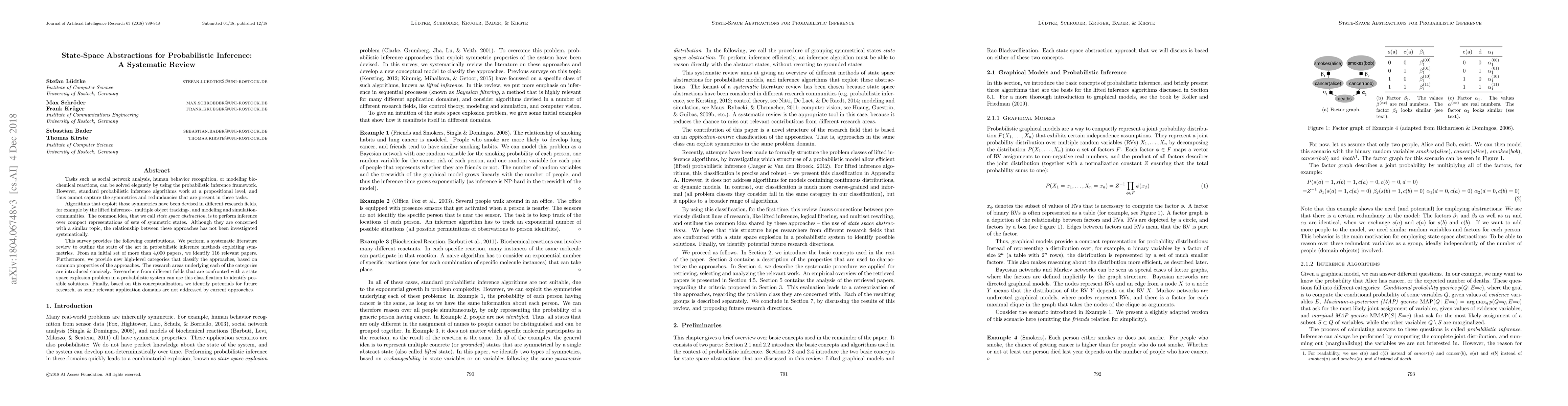 Tasks such as social network analysis, human behavior recognition, or modeling biochemical reactions, can be solved elegantly by using the probabilistic inference framework. However, standard probabilistic inference algorithms work at a propositional level, and thus cannot capture the symmetries and redundancies that are present in these tasks. Algorithms that exploit those symmetries have been devised in different research fields, for example by the lifted inference-, multiple object tracking-, and modeling and simulation-communities. The common idea, that we call state space abstraction, is to perform inference over compact representations of sets of symmetric states. Although they are concerned with a similar topic, the relationship between these approaches has not been investigated systematically. This survey provides the following contributions. We perform a systematic literature review to outline the state of the art in probabilistic inference methods exploiting symmetries. From an initial set of more than 4,000 papers, we identify 116 relevant papers. Furthermore, we provide new high-level categories that classify the approaches, based on common properties of the approaches. The research areas underlying each of the categories are introduced concisely. Researchers from different fields that are confronted with a state space explosion problem in a probabilistic system can use this classification to identify possible solutions. Finally, based on this conceptualization, we identify potentials for future research, as some relevant application domains are not addressed by current approaches.