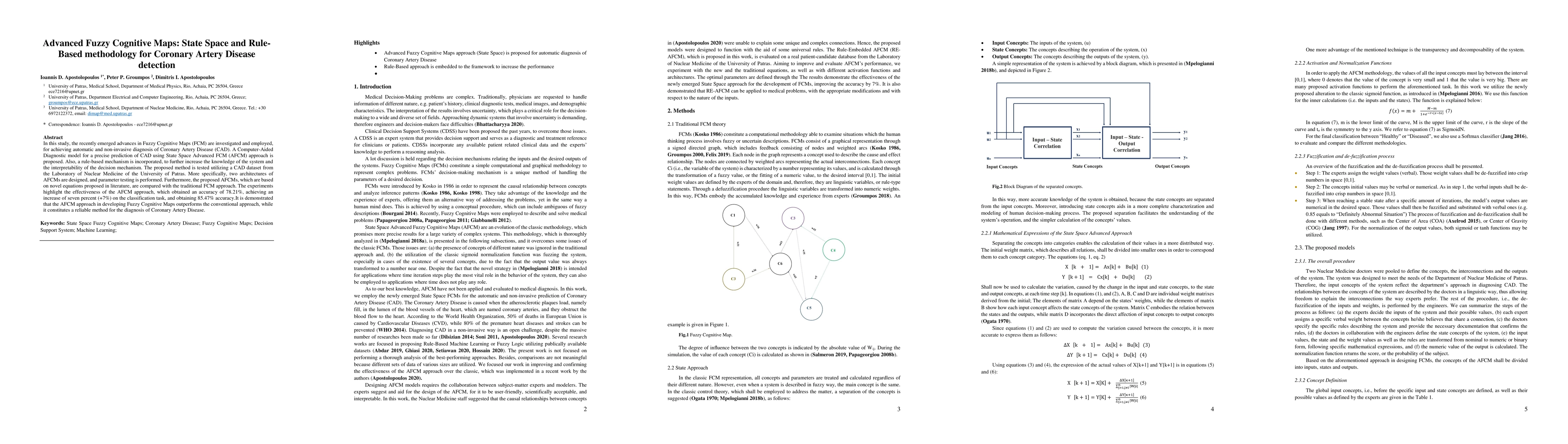 Purpose: In this study, the recently emerged advances in Fuzzy Cognitive Maps (FCM) are investigated and employed, for achieving the automatic and non-invasive diagnosis of Coronary Artery Disease (CAD). Methods: A Computer-Aided Diagnostic model for the acceptable and non-invasive prediction of CAD using the State Space Advanced FCM (AFCM) approach is proposed. Also, a rule-based mechanism is incorporated, to further increase the knowledge of the system and the interpretability of the decision mechanism. The proposed method is tested utilizing a CAD dataset from the Laboratory of Nuclear Medicine of the University of Patras. More specifically, two architectures of AFCMs are designed, and different parameter testing is performed. Furthermore, the proposed AFCMs, which are based on the new equations proposed recently, are compared with the traditional FCM approach. Results: The experiments highlight the effectiveness of the AFCM approach and the new equations over the traditional approach, which obtained an accuracy of 78.21%, achieving an increase of seven percent (+7%) on the classification task, and obtaining 85.47% accuracy. Conclusions: It is demonstrated that the AFCM approach in developing Fuzzy Cognitive Maps outperforms the conventional approach, while it constitutes a reliable method for the diagnosis of Coronary Artery Disease. Conclusions and future research related to recent pandemic of coronavirus are provided.