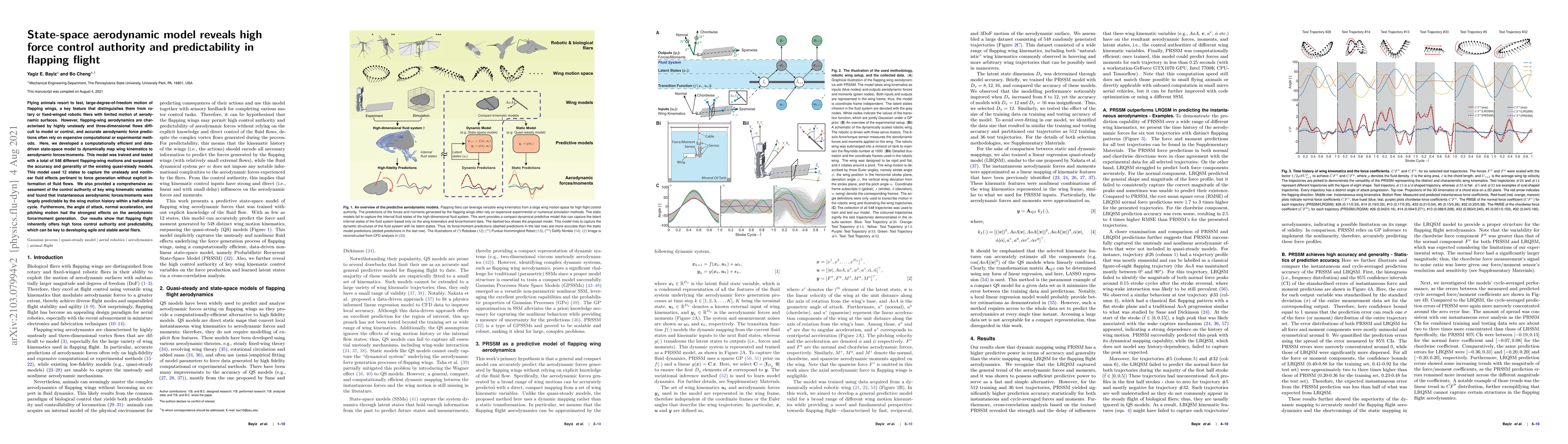 This paper presents a computationally efficient state-space model that accurately maps flapping wing kinematics to aerodynamic forces, demonstrating high control authority and predictability in flapping flight. The model highlights that wing motion history within a half-stroke cycle strongly influences aerodynamic forces, with angle of attack, normal acceleration, and pitching motion being the most impactful.