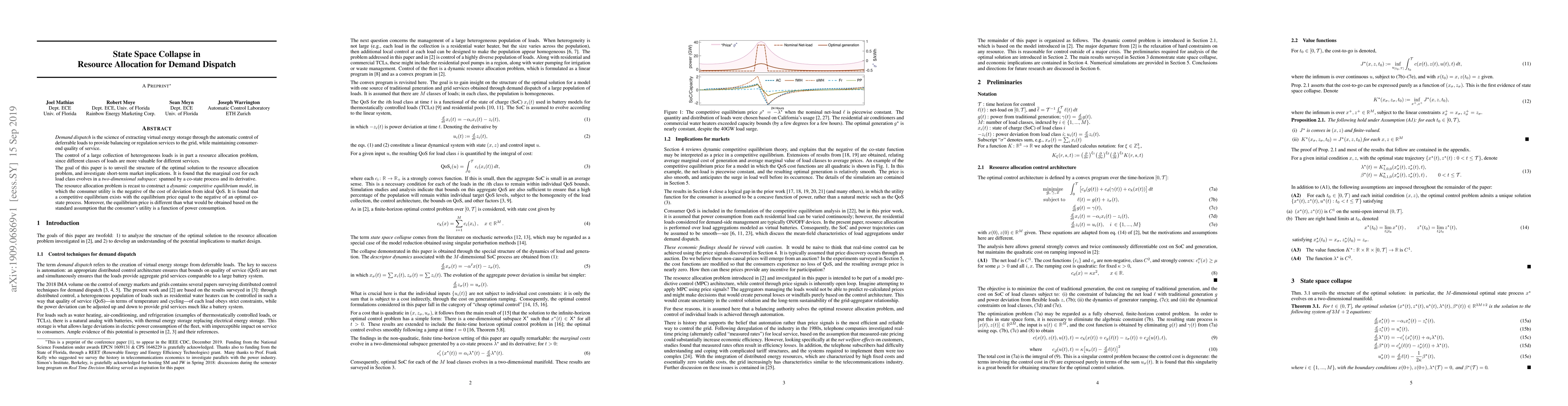 Demand dispatch is the science of extracting virtual energy storage through the automatic control of deferrable loads to provide balancing or regulation services to the grid, while maintaining consumer-end quality of service (QoS). The control of a large collection of heterogeneous loads is in part a resource allocation problem, since different classes of loads are valuable for different services. The goal of this paper is to unveil the structure of the optimal solution to the resource allocation problem and to investigate short term market implications. It is found that the marginal cost for each load class evolves on a two-dimensional subspace, spanned by an optimal costate process and its derivative. The resource allocation problem is recast to construct a dynamic competitive equilibrium model, in which the consumer utility is the negative of the cost of deviation from ideal QoS. It is found that a competitive equilibrium exists, with the equilibrium price equal to the negative of an optimal costate process. Moreover, the equilibrium price is different from what would be obtained based on the standard assumption that the consumer's utility is a function of power consumption.