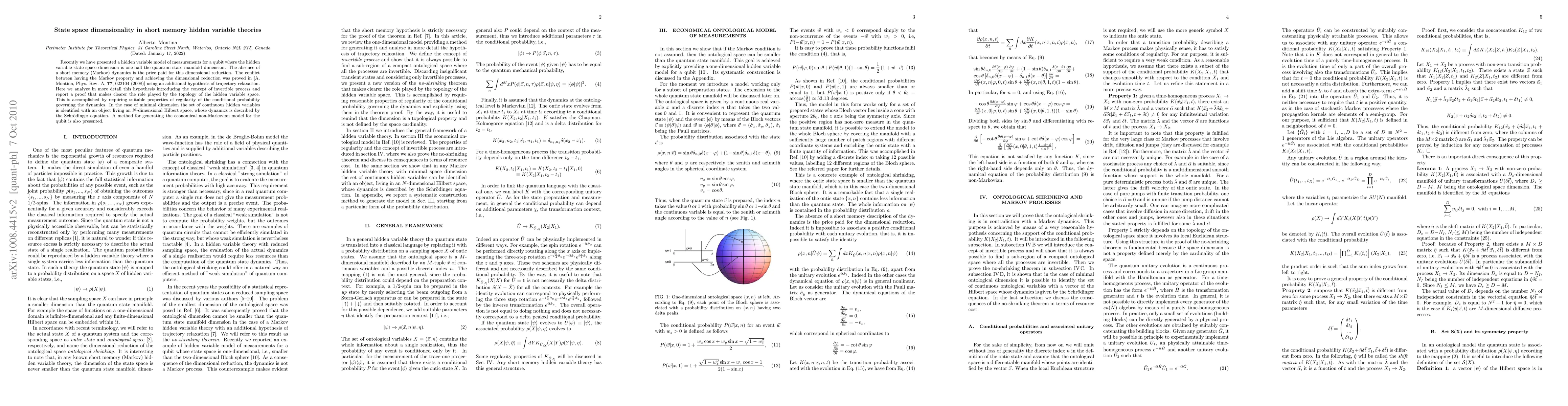 Recently we have presented a hidden variable model of measurements for a qubit where the hidden variable state space dimension is one-half the quantum state manifold dimension. The absence of a short memory (Markov) dynamics is the price paid for this dimensional reduction. The conflict between having the Markov property and achieving the dimensional reduction was proved in [A. Montina, Phys. Rev. A, 77, 022104 (2008)] using an additional hypothesis of trajectory relaxation. Here we analyze in more detail this hypothesis introducing the concept of invertible process and report a proof that makes clearer the role played by the topology of the hidden variable space. This is accomplished by requiring suitable properties of regularity of the conditional probability governing the dynamics. In the case of minimal dimension the set of continuous hidden variables is identified with an object living an N-dimensional Hilbert space, whose dynamics is described by the Schr\"odinger equation. A method for generating the economical non-Markovian model for the qubit is also presented.