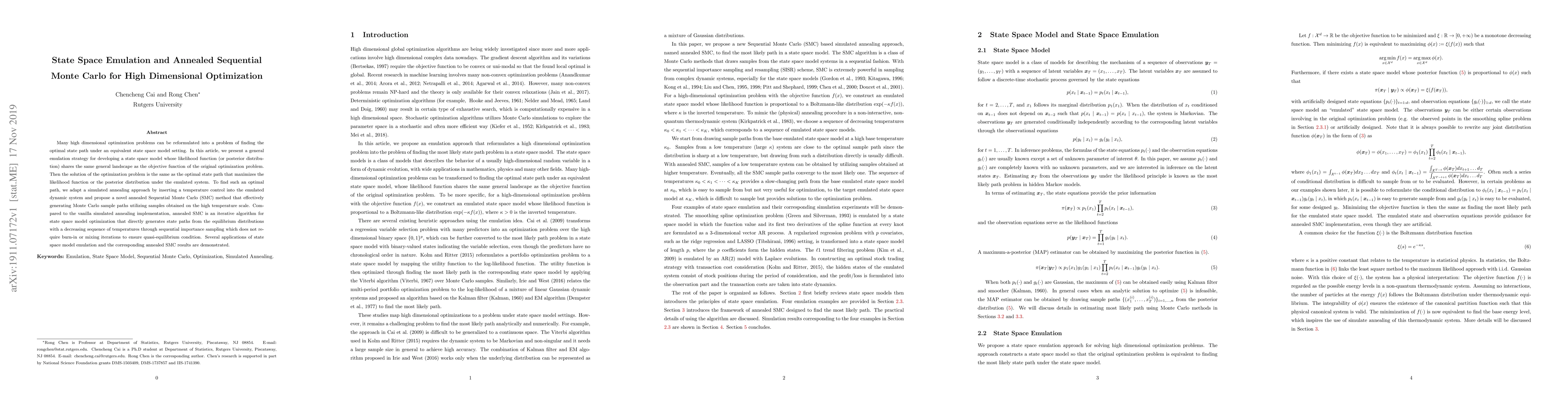 Many high dimensional optimization problems can be reformulated into a problem of finding theoptimal state path under an equivalent state space model setting. In this article, we present a general emulation strategy for developing a state space model whose likelihood function (or posterior distribution) shares the same general landscape as the objective function of the original optimization problem. Then the solution of the optimization problem is the same as the optimal state path that maximizes the likelihood function or the posterior distribution under the emulated system. To find such an optimal path, we adapt a simulated annealing approach by inserting a temperature control into the emulated dynamic system and propose a novel annealed Sequential Monte Carlo (SMC) method that effectively generating Monte Carlo sample paths utilizing samples obtained on the high temperature scale. Compared to the vanilla simulated annealing implementation, annealed SMC is an iterative algorithm for state space model optimization that directly generates state paths from the equilibrium distributions with a decreasing sequence of temperatures through sequential importance sampling which does not require burn-in or mixing iterations to ensure quasi-equilibrium condition. Several applications of state space model emulation and the corresponding annealed SMC results are demonstrated.