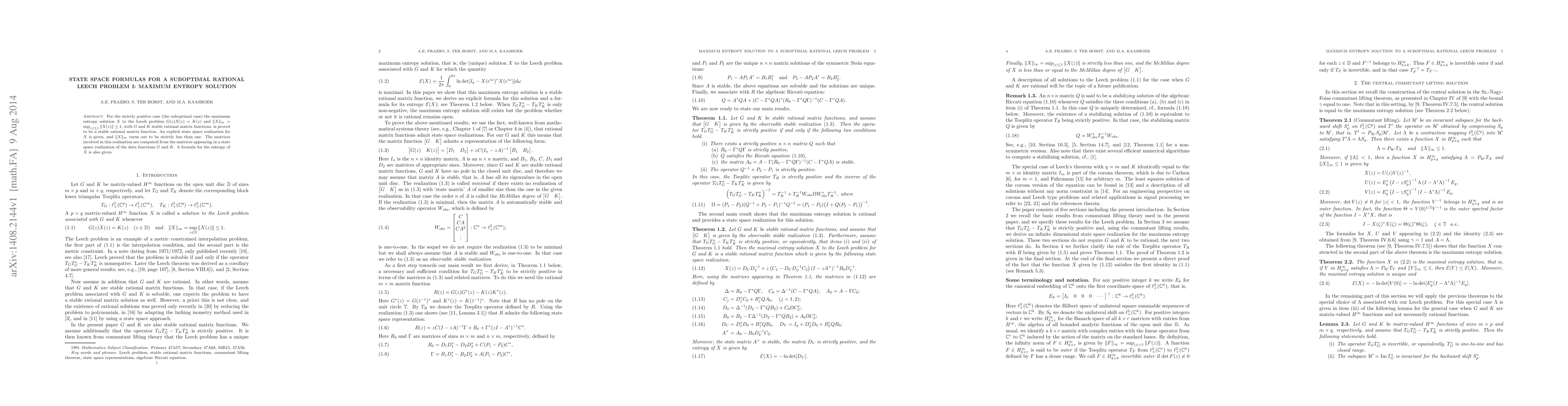 For the strictly positive case (the suboptimal case) the maximum entropy solution $X$ to the Leech problem $G(z)X(z)=K(z)$ and $\|X\|_\infty=\sup_{|z|\leq 1}\|X(z)\|\leq 1$, with $G$ and $K$ stable rational matrix functions, is proved to be a stable rational matrix function. An explicit state space realization for $X$ is given, and $\|X\|_\infty$ turns out to be strictly less than one. The matrices involved in this realization are computed from the matrices appearing in a state space realization of the data functions $G$ and $K$. A formula for the entropy of $X$ is also given.