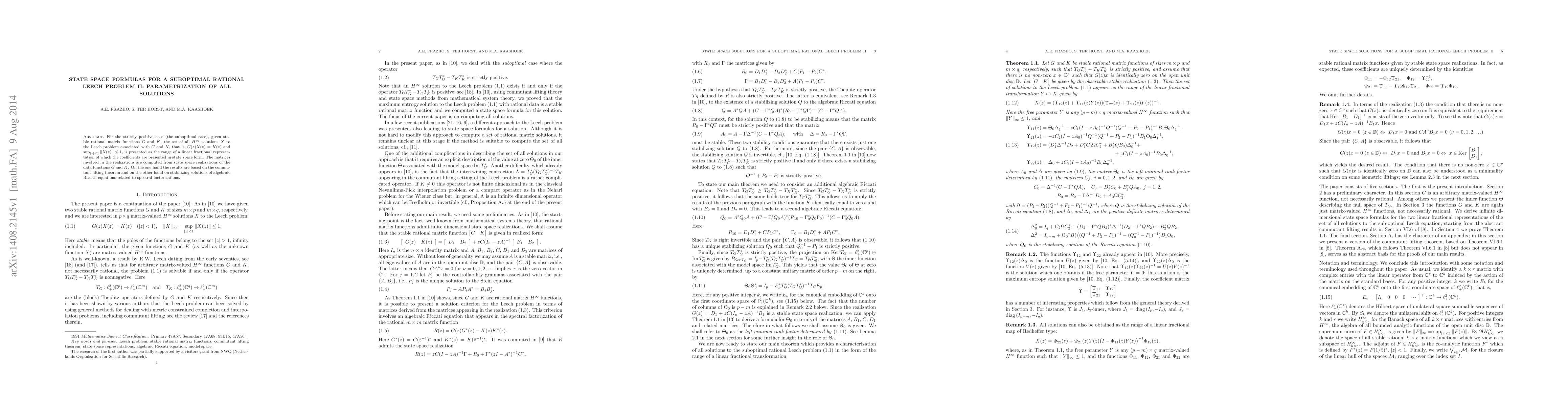 For the strictly positive case (the suboptimal case), given stable rational matrix functions $G$ and $K$, the set of all $H^\infty$ solutions $X$ to the Leech problem associated with $G$ and $K$, that is, $G(z)X(z)=K(z)$ and $\sup_{|z|\leq 1}\|X(z)\|\leq 1$, is presented as the range of a linear fractional representation of which the coefficients are presented in state space form. The matrices involved in the realizations are computed from state space realizations of the data functions $G$ and $K$. On the one hand the results are based on the commutant lifting theorem and on the other hand on stabilizing solutions of algebraic Riccati equations related to spectral factorizations.
