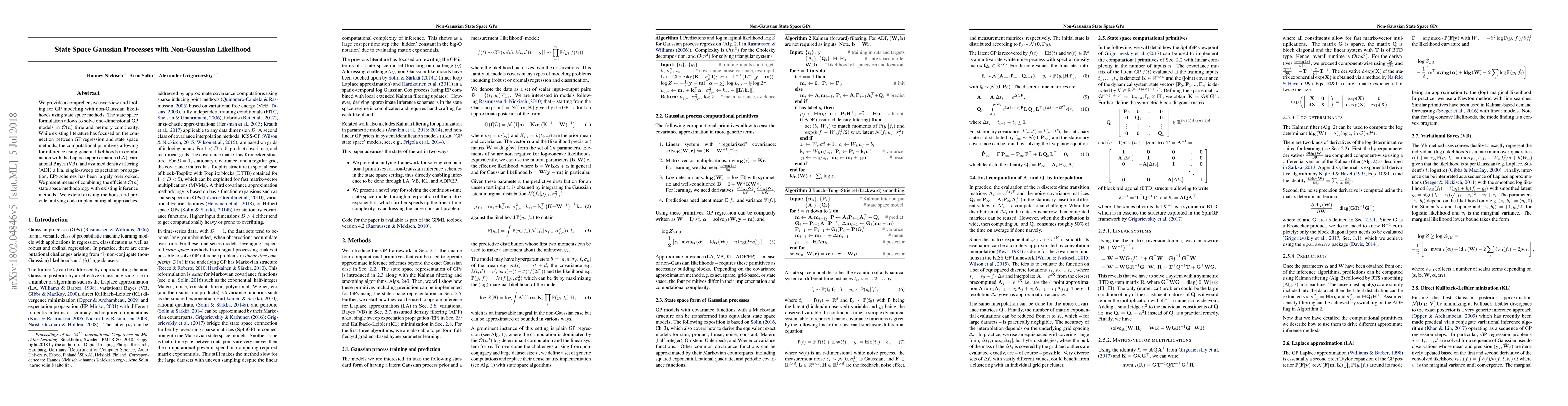 We provide a comprehensive overview and tooling for GP modeling with non-Gaussian likelihoods using state space methods. The state space formulation allows for solving one-dimensional GP models in $\mathcal{O}(n)$ time and memory complexity. While existing literature has focused on the connection between GP regression and state space methods, the computational primitives allowing for inference using general likelihoods in combination with the Laplace approximation (LA), variational Bayes (VB), and assumed density filtering (ADF, a.k.a. single-sweep expectation propagation, EP) schemes has been largely overlooked. We present means of combining the efficient $\mathcal{O}(n)$ state space methodology with existing inference methods. We extend existing methods, and provide unifying code implementing all approaches.