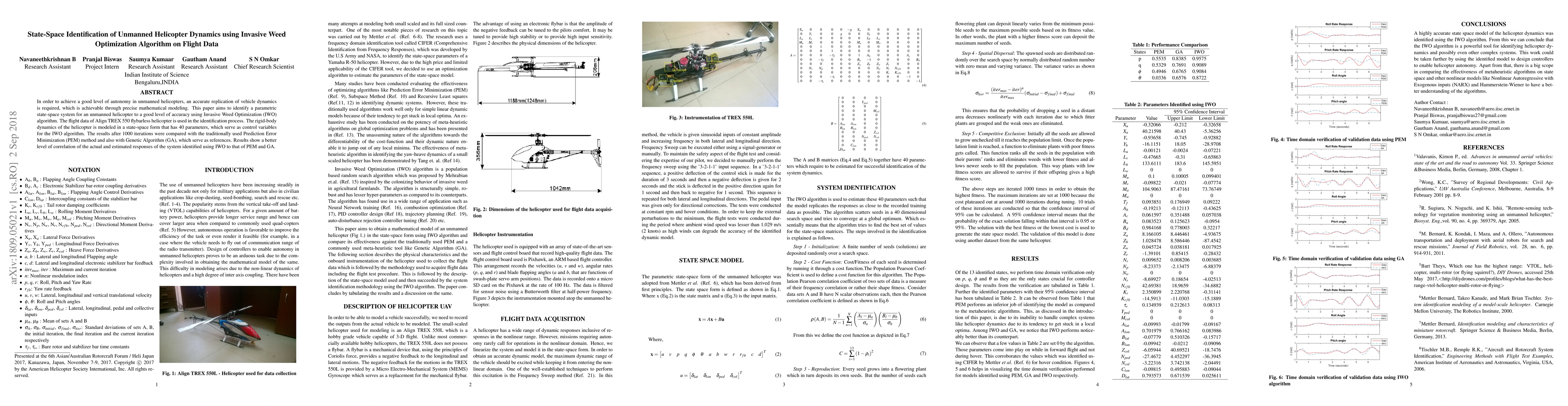 This paper uses the Invasive Weed Optimization (IWO) algorithm to identify a parametric state-space model for an unmanned helicopter based on flight data. The results show that IWO provides a better correlation between actual and estimated system responses compared to the Prediction Error Minimization (PEM) method and Genetic Algorithm (GA).