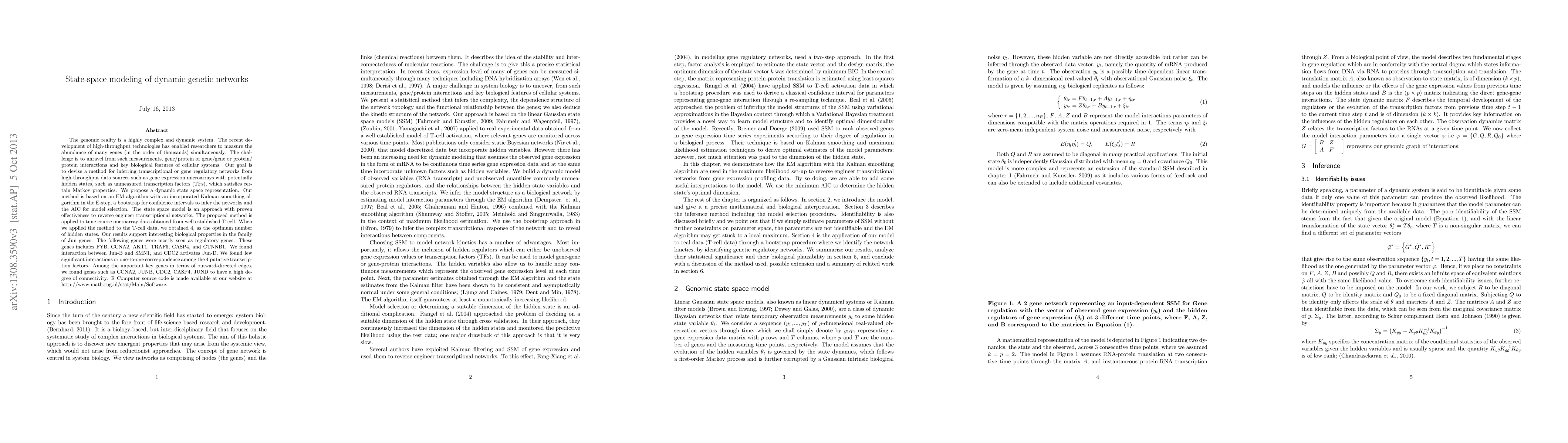 The genomic reality is a highly complex and dynamic system. The recent development of high-throughput technologies has enabled researchers to measure the abundance of many genes (in the order of thousands) simultaneously. The challenge is to unravel from such measurements, gene/protein or gene/gene or protein/ protein interactions and key biological features of cellular systems. Our goal is to devise a method for inferring transcriptional or gene regulatory networks from high-throughput data sources such as gene expression microarrays with potentially hidden states, such as unmeasured transcription factors (TFs), which satisfies certain Markov properties. We propose a dynamic state space representation. Our method is based on an EM algorithm with an incorporated Kalman smoothing algorithm in the E-step, a bootstrap for confidence intervals to infer the networks and the AIC for model selection. The state space model is an approach with proven effectiveness to reverse engineer transcriptional networks. The proposed method is applied to time course microarray data obtained from well established T-cell. When we applied the method to the T-cell data, we obtained 4, as the optimum number of hidden states. Our results support interesting biological properties in the family of Jun genes. The following genes were mostly seen as regulatory genes. These genes includes FYB, CCNA2, AKT1, TRAF5, CASP4, and CTNNB1. We found interaction between Jun-B and SMN1, and CDC2 activates Jun-D. We found few significant interactions or one-to-one correspondence among the 4 putative transcription factors. Among the important key genes in terms of outward-directed edges, we found genes such as CCNA2, JUNB, CDC2, CASP4, JUND to have a high degree of connectivity. R Computer source code is made available at our website at http://www.math.rug.nl/stat/Main/Software.