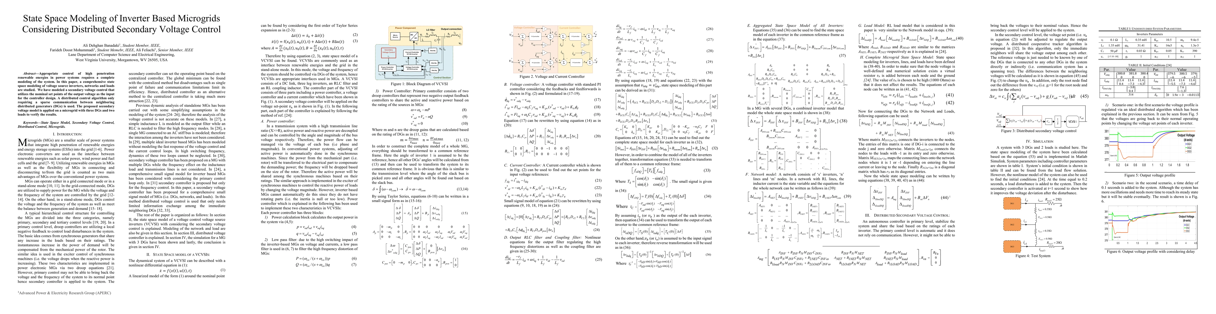 Appropriate control of high penetration renewable energies in power systems requires a complete modeling of the system. In this paper, a comprehensive state space modeling of voltage source inverters, networks and loads are studied. We have modeled a secondary voltage control that utilizes the nominal set points of the output voltage as the input for the controller design. A distributed control algorithm only requiring a sparse communication between neighboring distributed generators (DGs) is used. The proposed secondary voltage model is applied on a microgrid with three DGs and two loads to verify the results.