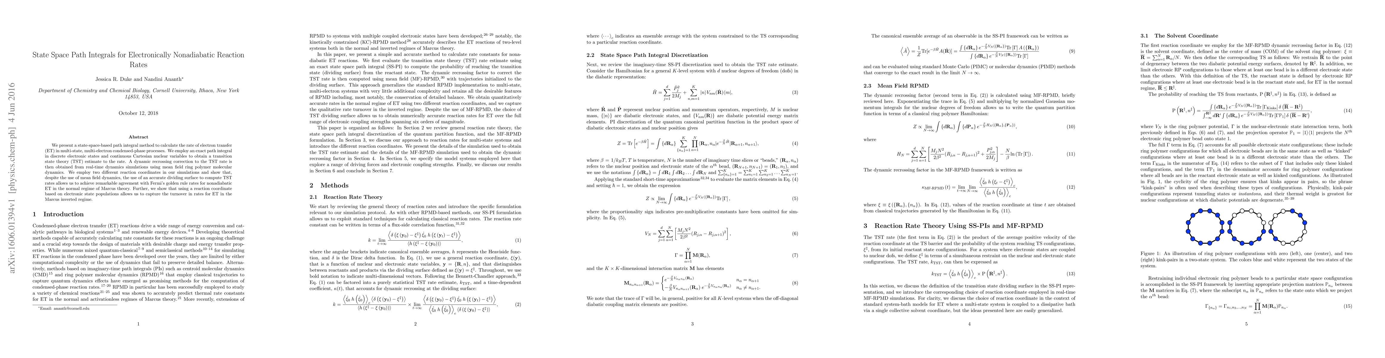 We present a state-space-based path integral method to calculate the rate of electron transfer (ET) in multi-state, multi-electron condensed-phase processes. We employ an exact path integral in discrete electronic states and continuous Cartesian nuclear variables to obtain a transition state theory (TST) estimate to the rate. A dynamic recrossing correction to the TST rate is then obtained from real-time dynamics simulations using mean field ring polymer molecular dynamics. We employ two different reaction coordinates in our simulations and show that, despite the use of mean field dynamics, the use of an accurate dividing surface to compute TST rates allows us to achieve remarkable agreement with Fermi's golden rule rates for nonadiabatic ET in the normal regime of Marcus theory. Further, we show that using a reaction coordinate based on electronic state populations allows us to capture the turnover in rates for ET in the Marcus inverted regime.