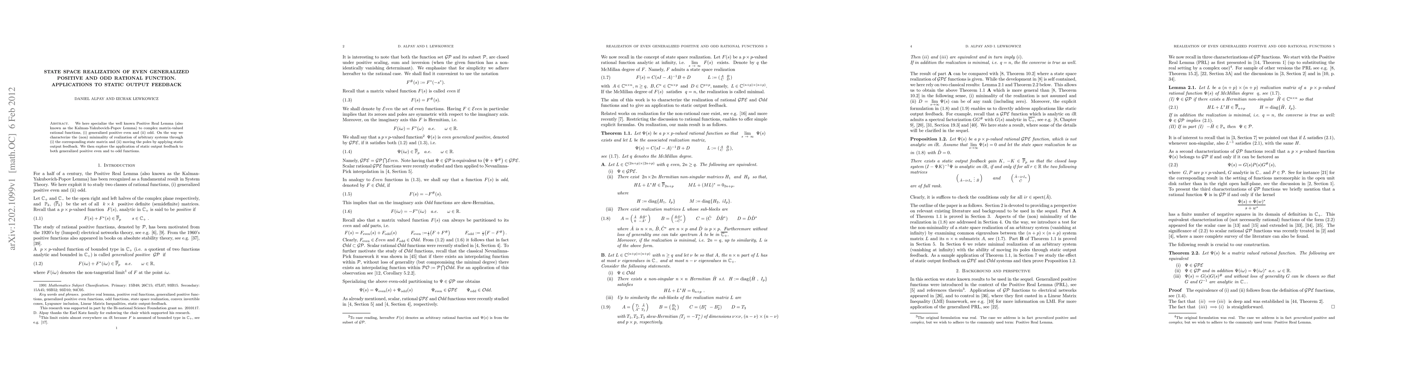 We here specialize the well known Positive Real Lemma (also known as the Kalman-Yakubovich-Popov Lemma) to complex matrix-valued rational functions, (i) generalized positive even and (ii) odd. On the way we characterize the (non) minimality of realization of arbitrary systems through (i) the corresponding state matrix and (ii) moving the poles by applying static output feedback. We then explore the application of static output feedback to both generalized positive even and to odd functions.
