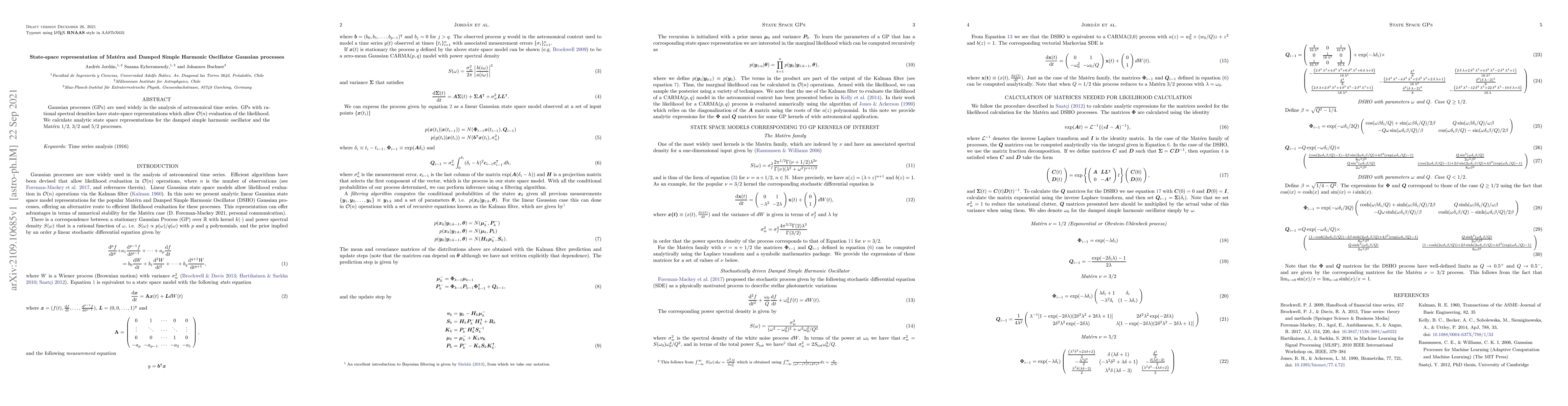 This paper develops state-space representations for Matérn and damped simple harmonic oscillator Gaussian processes, enabling efficient O(n) likelihood evaluation for astronomical time series analysis. Analytical expressions for these representations are derived for Matérn 1/2, 3/2, and 5/2 processes.