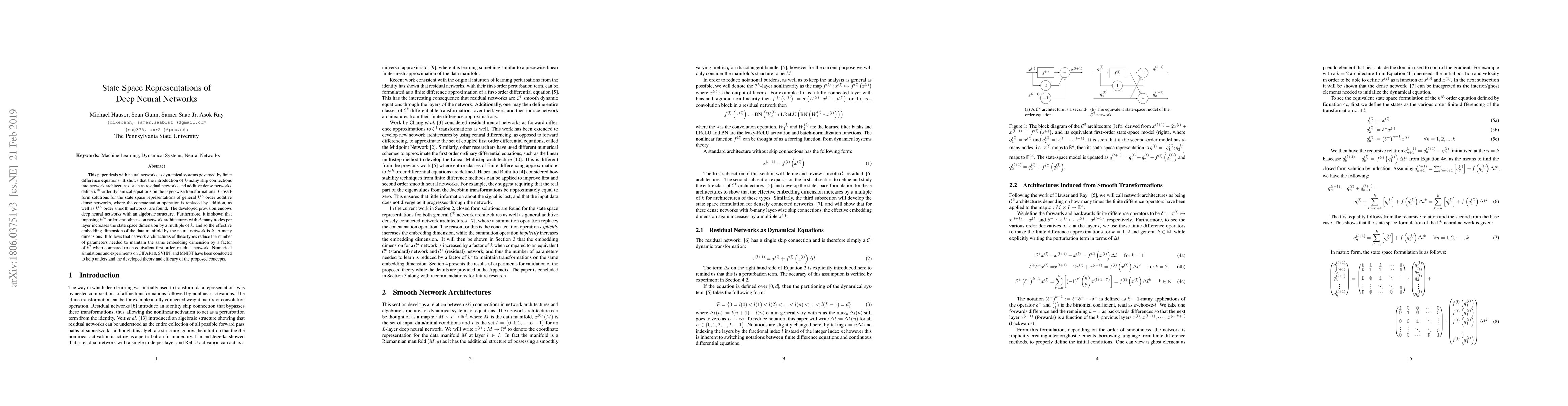 This paper deals with neural networks as dynamical systems governed by differential or difference equations. It shows that the introduction of skip connections into network architectures, such as residual networks and dense networks, turns a system of static equations into a system of dynamical equations with varying levels of smoothness on the layer-wise transformations. Closed form solutions for the state space representations of general dense networks, as well as $k^{th}$ order smooth networks, are found in general settings. Furthermore, it is shown that imposing $k^{th}$ order smoothness on a network architecture with $d$-many nodes per layer increases the state space dimension by a multiple of $k$, and so the effective embedding dimension of the data manifold is $k \cdot d$-many dimensions. It follows that network architectures of these types reduce the number of parameters needed to maintain the same embedding dimension by a factor of $k^2$ when compared to an equivalent first-order, residual network, significantly motivating the development of network architectures of these types. Numerical simulations were run to validate parts of the developed theory.
