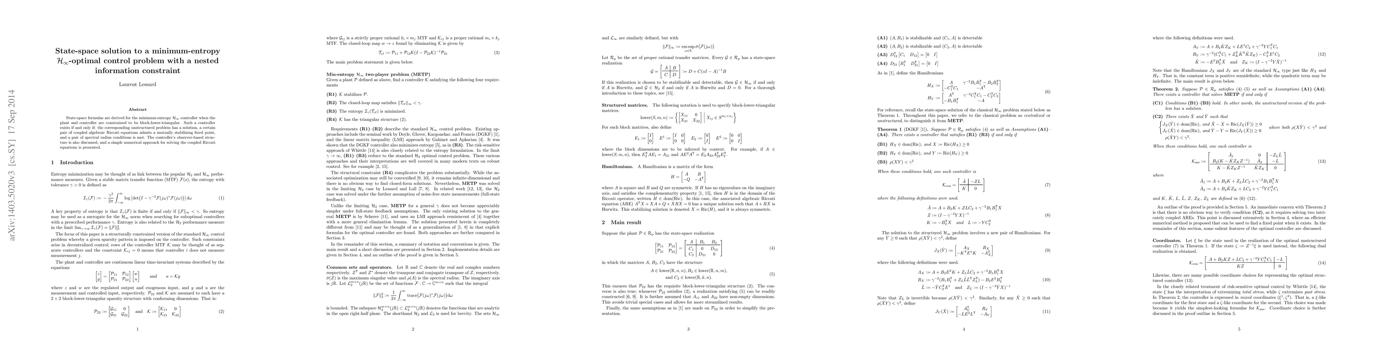 This paper derives state-space formulas for a minimum-entropy $\mathcal{H}_\infty$ controller under block-lower-triangular constraints, establishing conditions for its existence and presenting a numerical method for solving coupled algebraic Riccati equations. The study also discusses the observer-based structure of the controller.